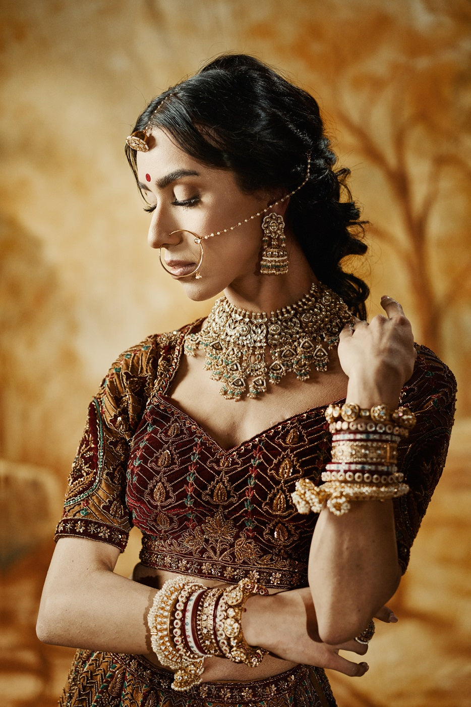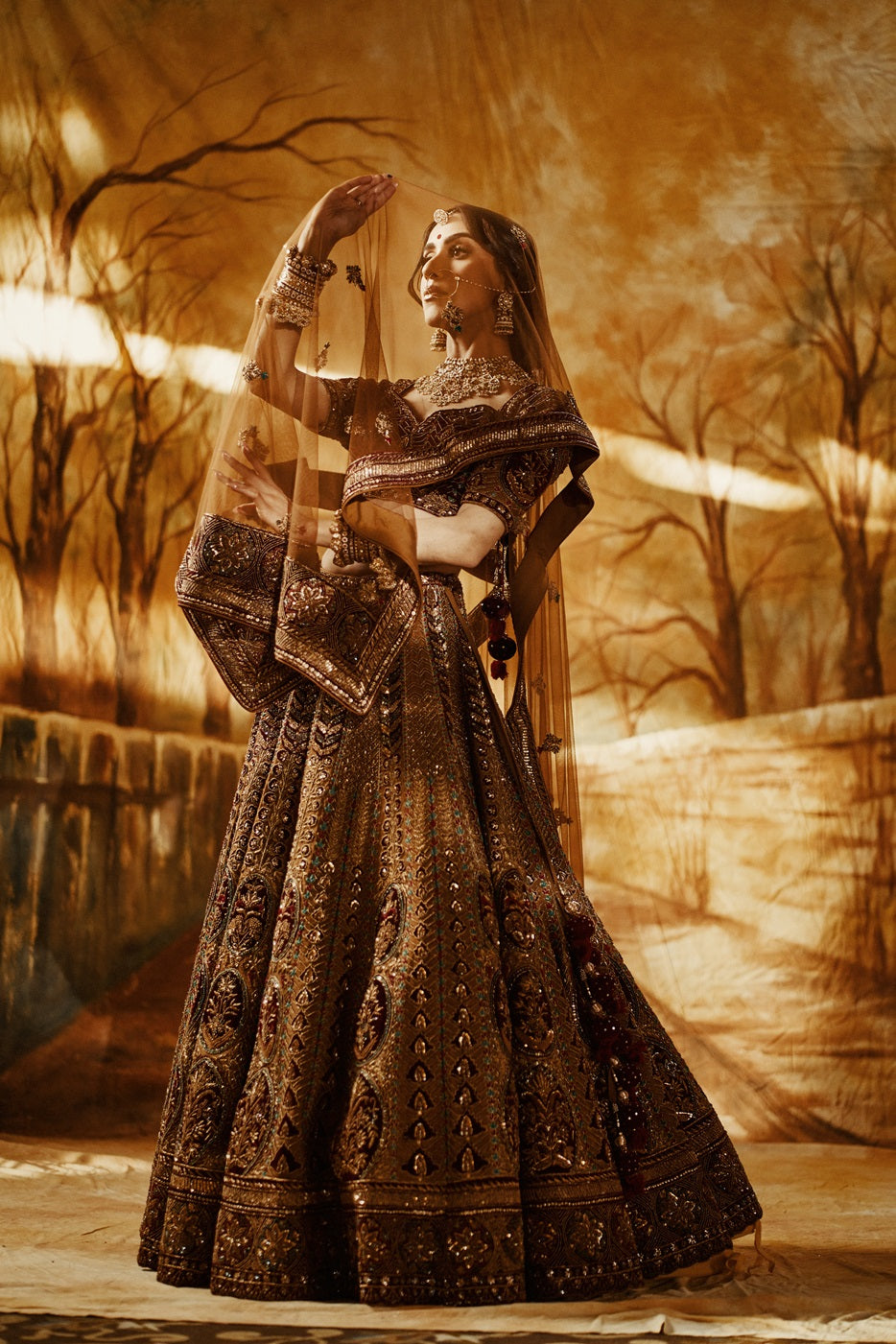 Copper Bridal Lehenga with Burgundy velvet applique adorned with antique gold zardozi embroidery.