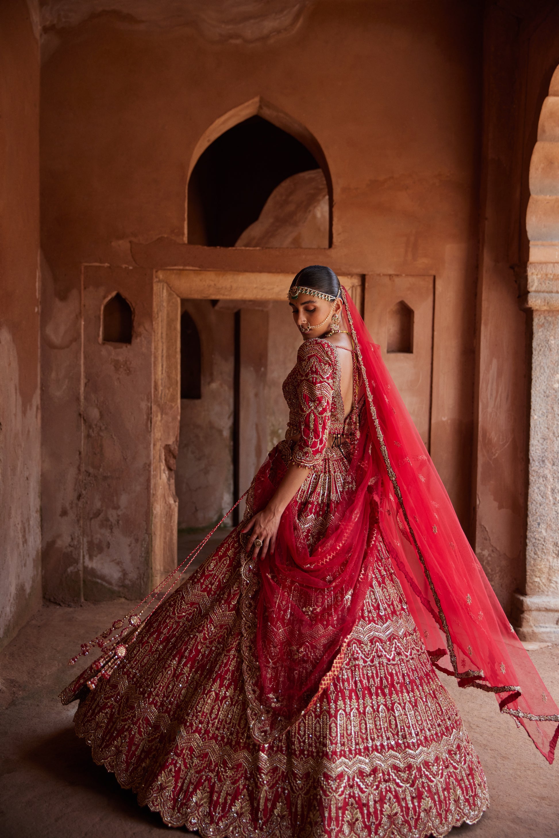 Exude sophistication with this cardinal red raw silk lehenga choli, paired with a coordinating belt and a scalloped net dupatta. Featuring a striking geometric embroidery pattern in gold dabka, zari, sequins, beads, and crystals, this ensemble is a testament to timeless craftsmanship. Elevate your bridal aura by pairing it with an optional embroidered head veil for a look that is both regal and enchanting.