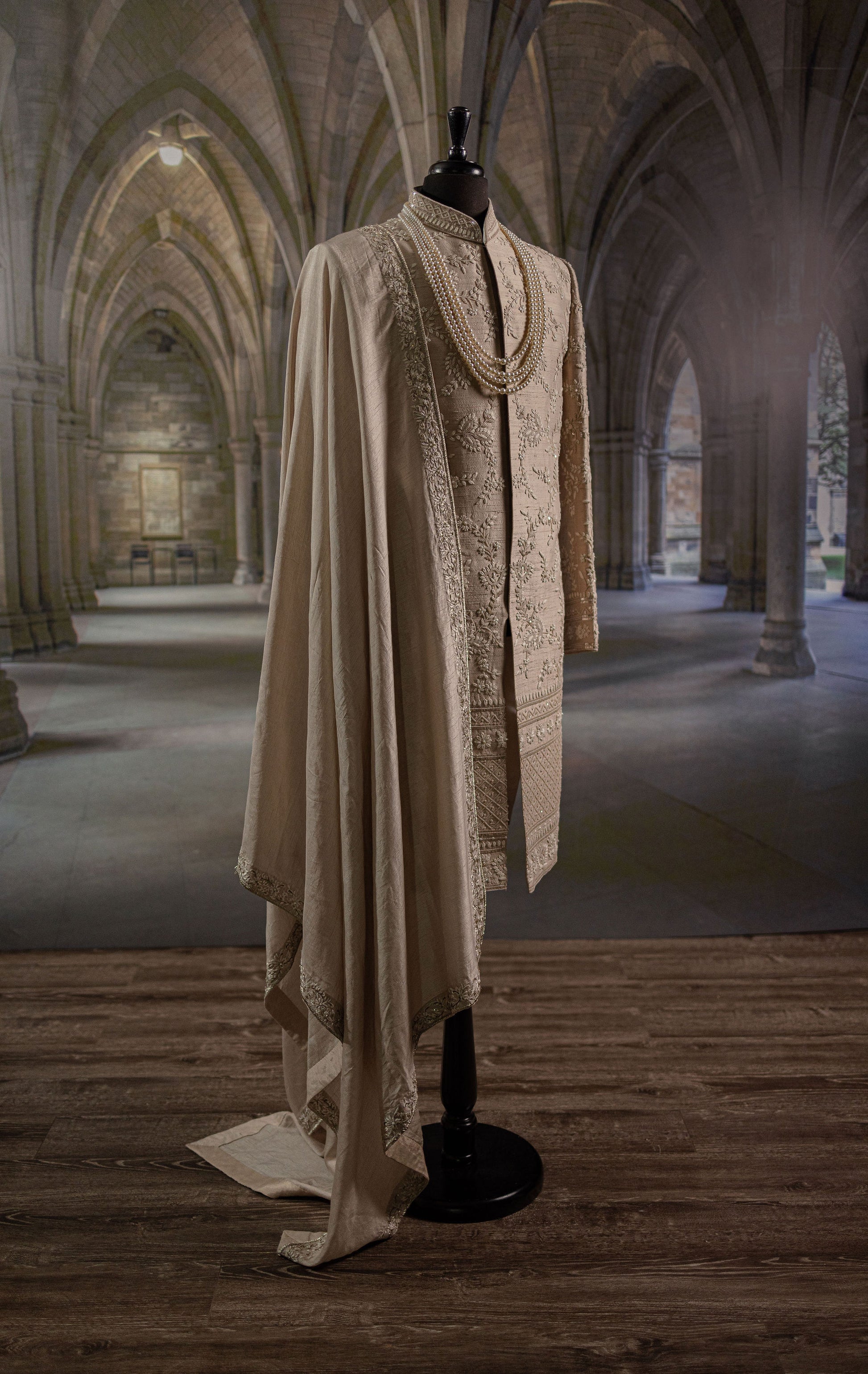 Our exquisite beige Sherwani, meticulously crafted with pearl hand embroidery. This opulent ensemble combines the richness of raw silk with the intricate artistry of pearl detailing, creating a masterpiece of elegance and style. Perfect for grand celebrations and cherished moments. Fully Customisable.