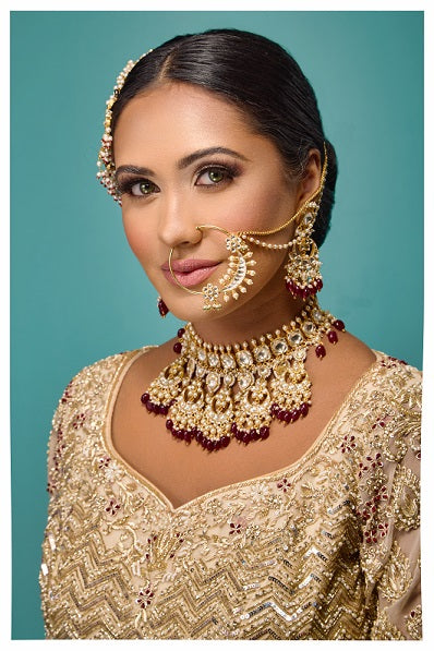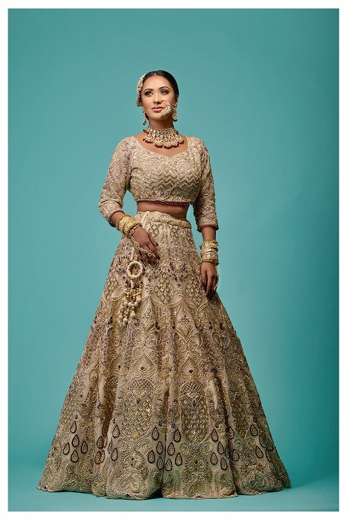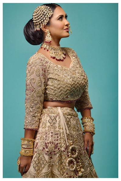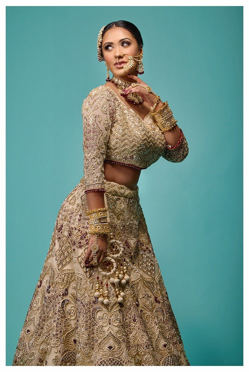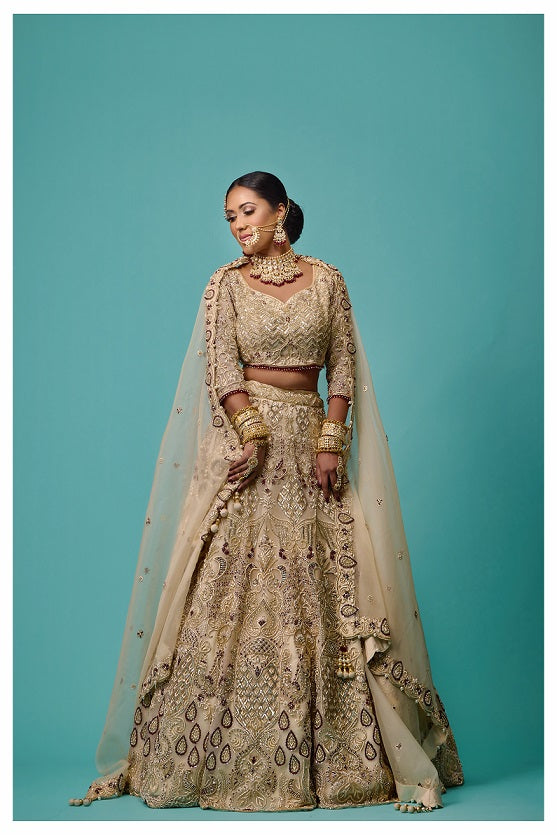 Champagne Gold tone on tone lengha with Maroon Embellishments. Making this the perfect versatile Bridal lengha for both a morning and an evening wedding look
