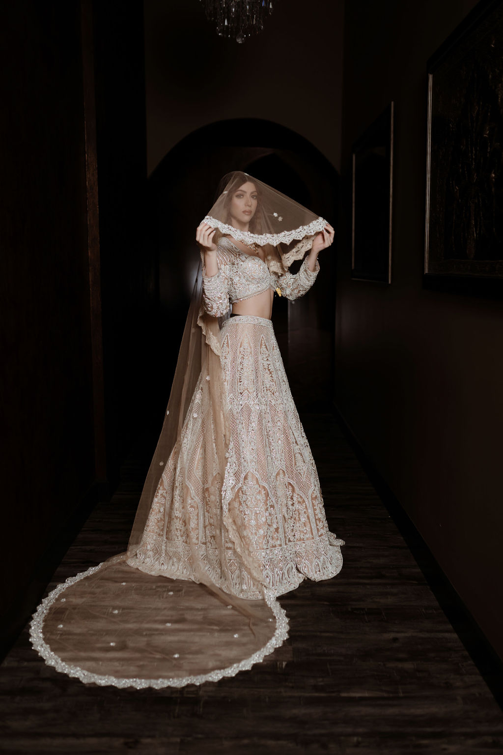 - Luxurious nude base fabric with ivory and silver embroidery.