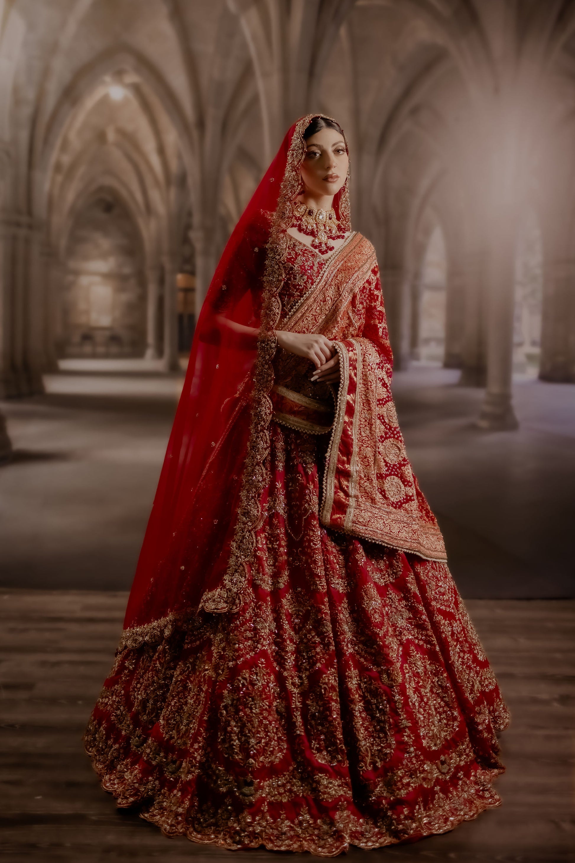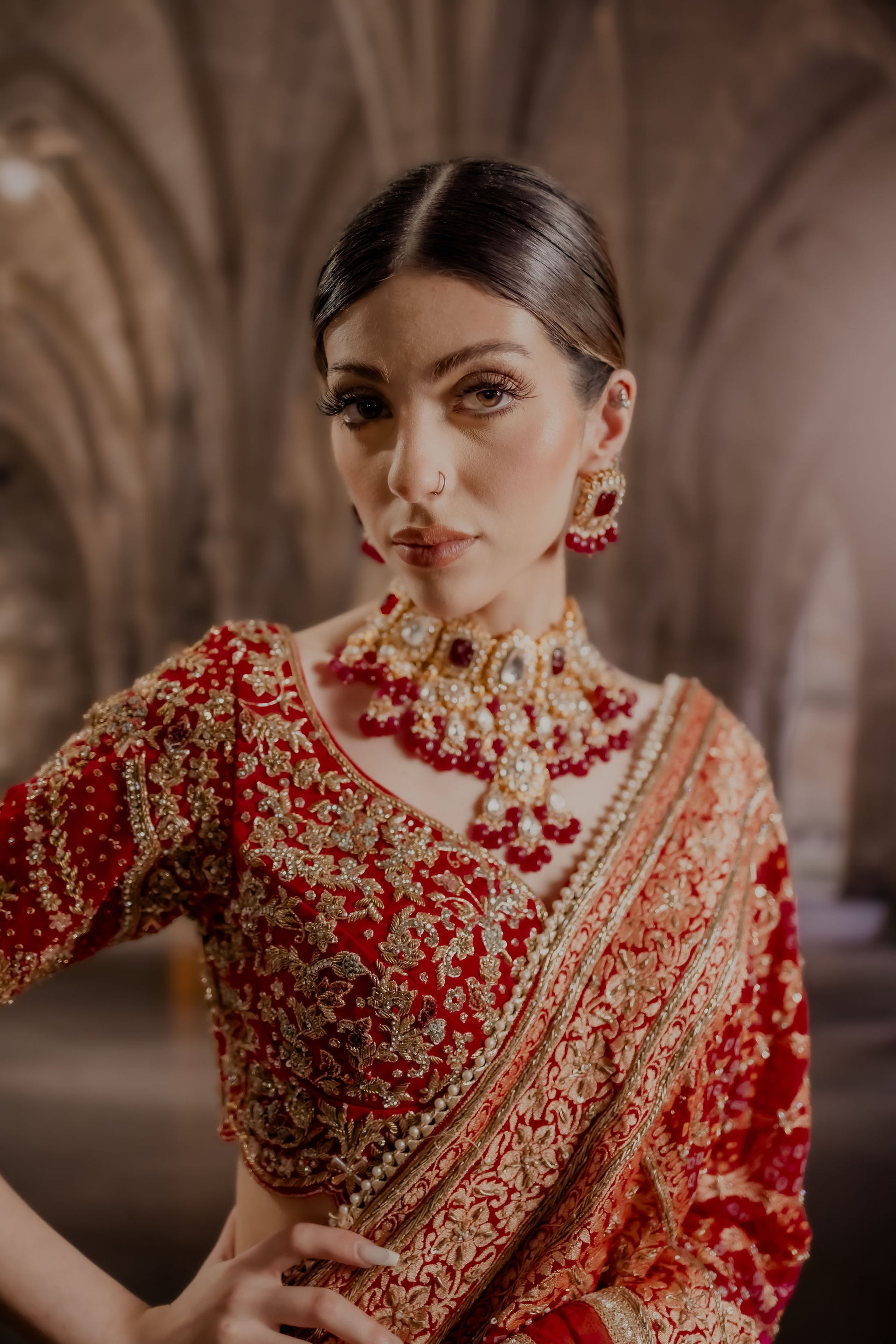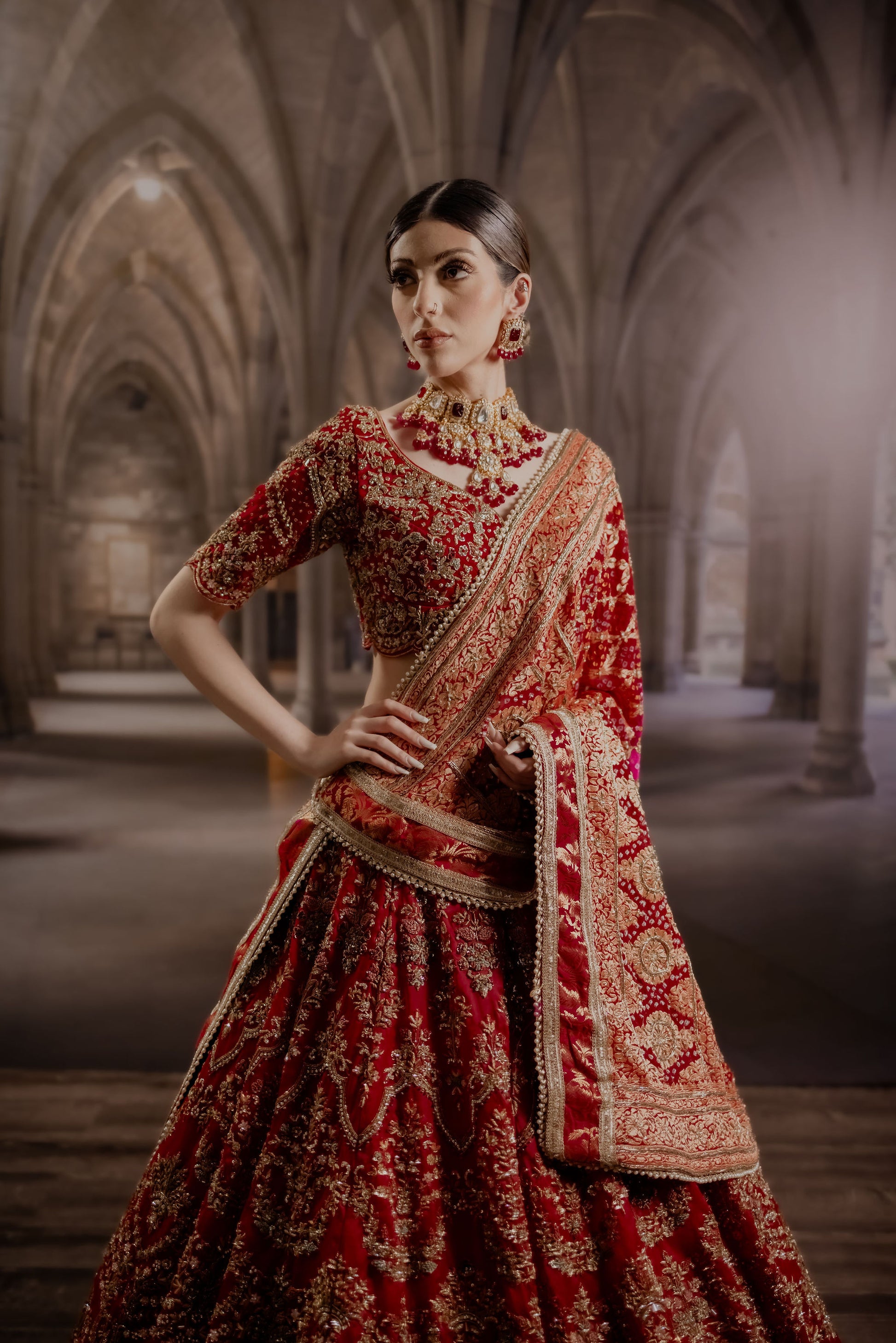- Adorned with intricate gold embroidery, including Zari, Zardozi, Resham, Kundan, and Dabka workmanship.