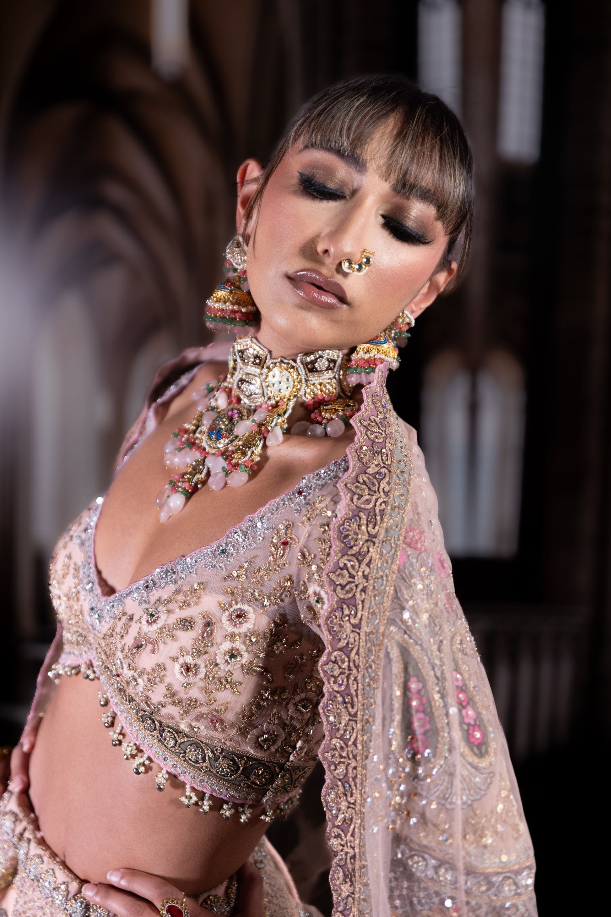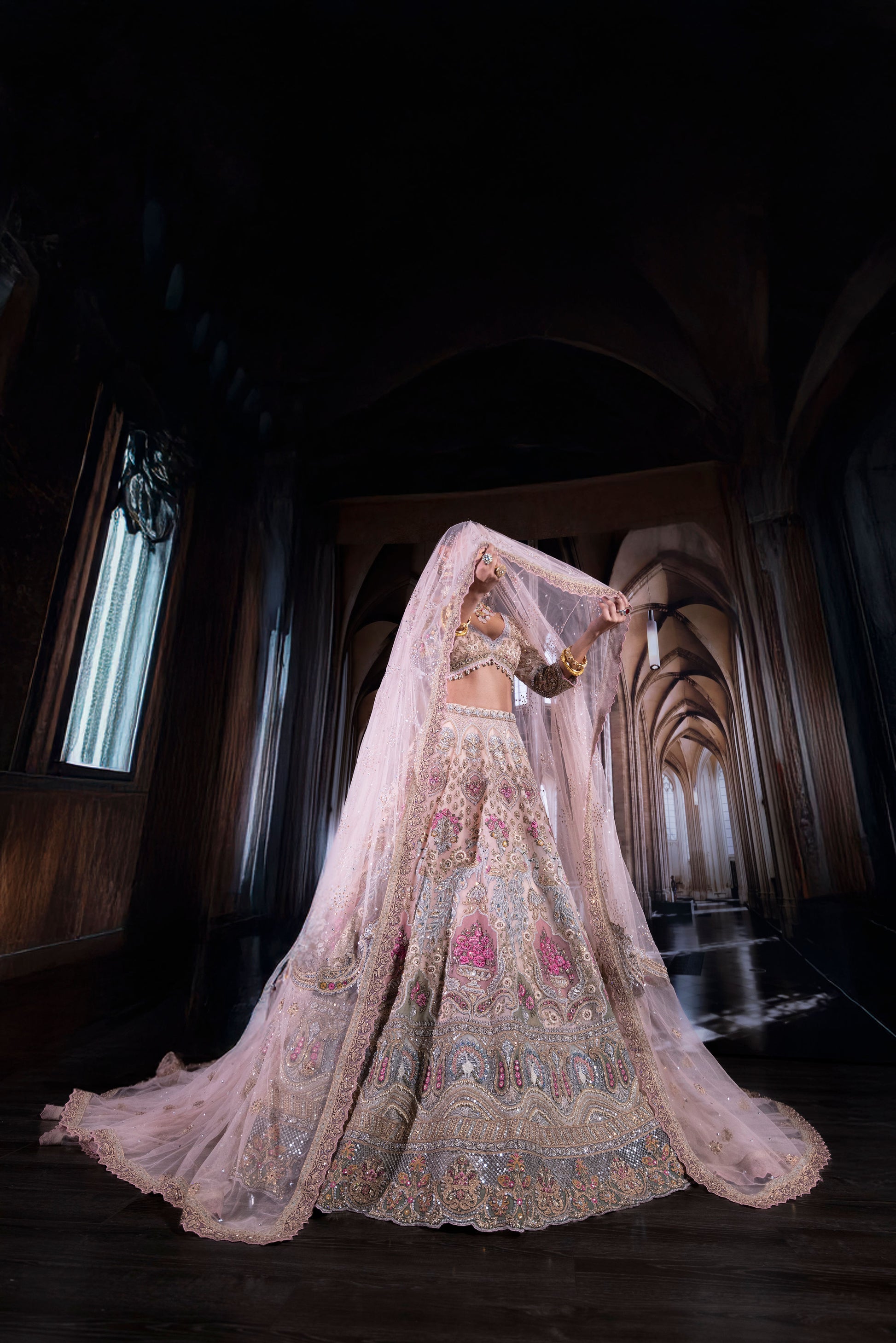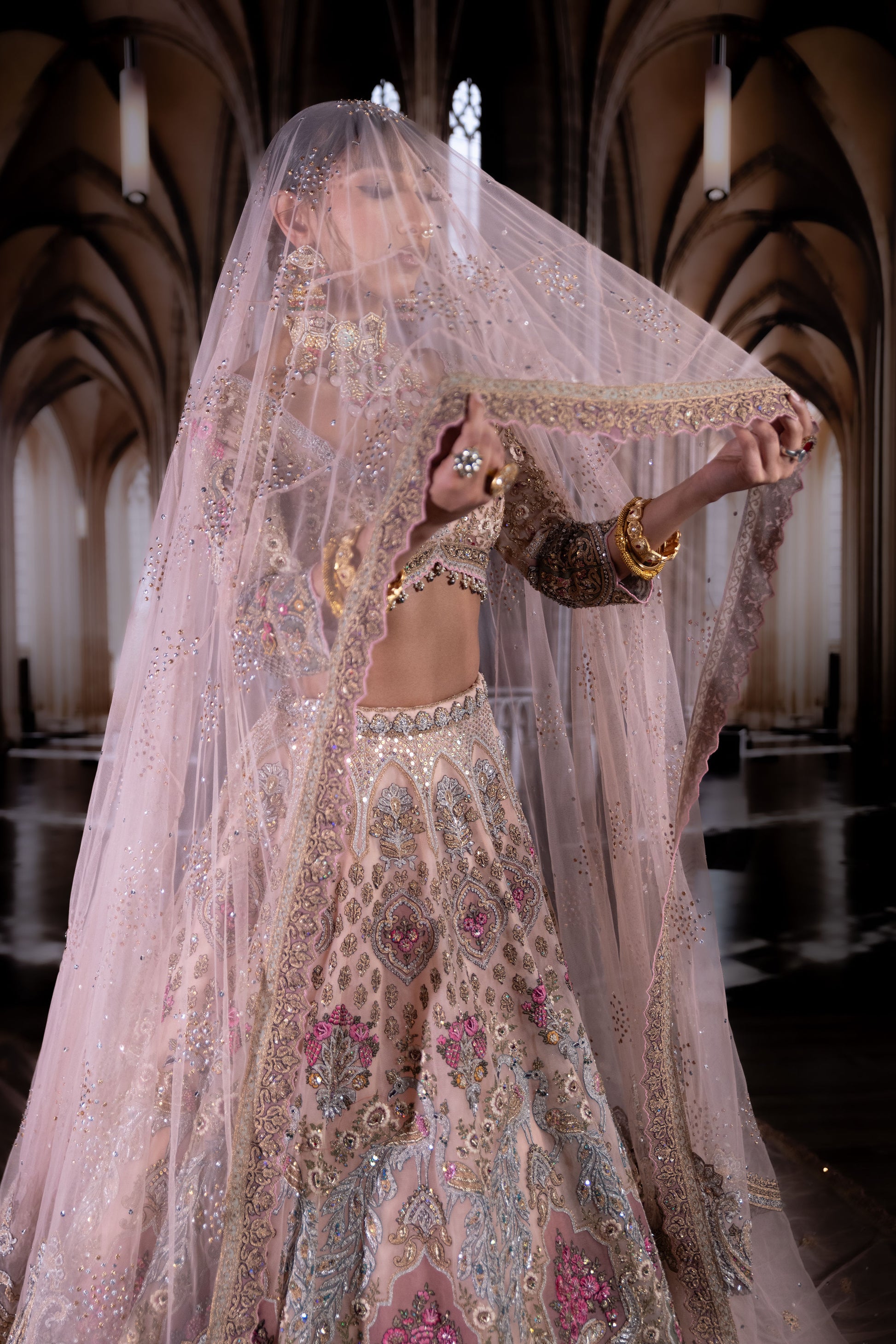 This blush pink lehenga exudes regal elegance with intricate embroidery, shimmering sequins, and delicate beadwork in blush, silver, and gold with accents of sage and rose. The voluminous skirt, complemented by a beautifully embellished blouse, showcases architectural and floral motifs. A sheer, adorned veil adds grace, making this ensemble a timeless blend of tradition and modern luxury.