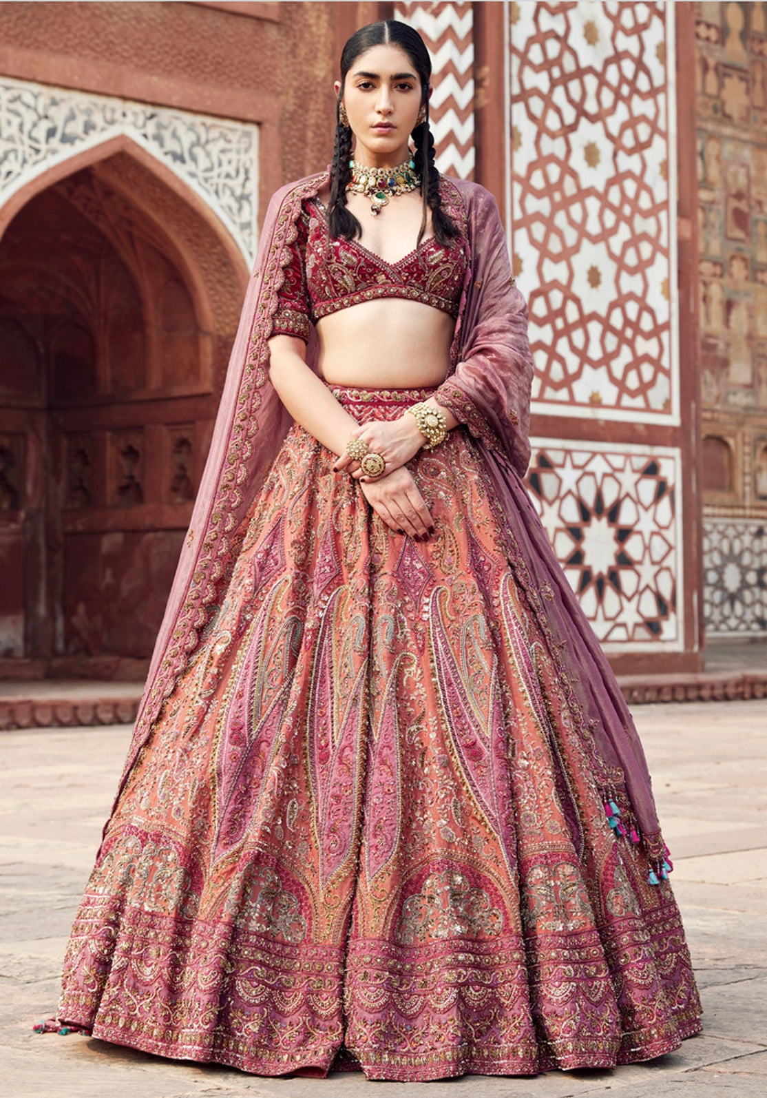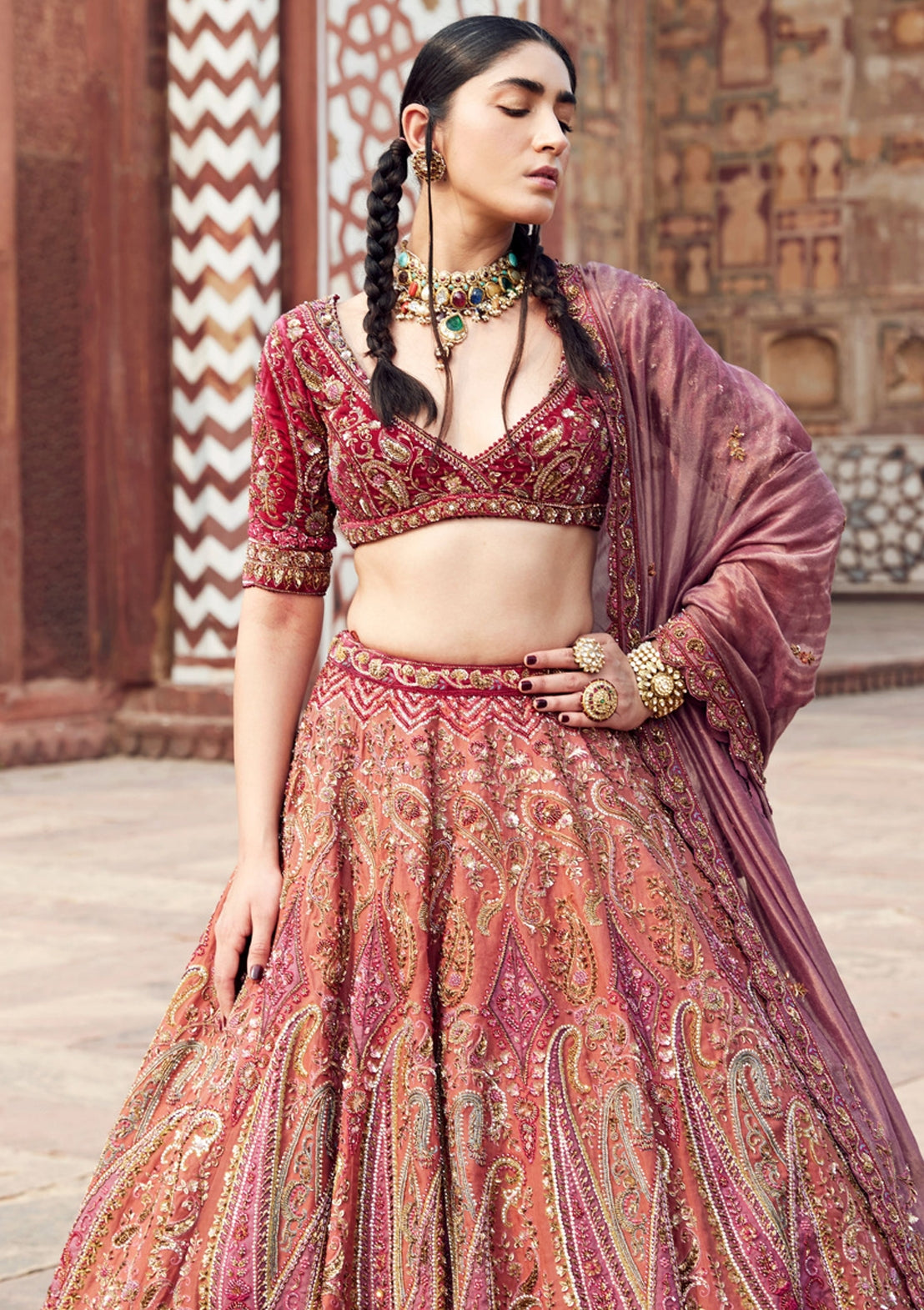 Make a bold and beautiful statement with our Maroon and Coral Embroidered Bridal Lehenga. The rich maroon base is beautifully complemented by vibrant coral accents, creating a stunning contrast that exudes elegance and warmth. Intricate embroidery adds a layer of sophistication and detail, making this lehenga a perfect blend of tradition and contemporary style.
