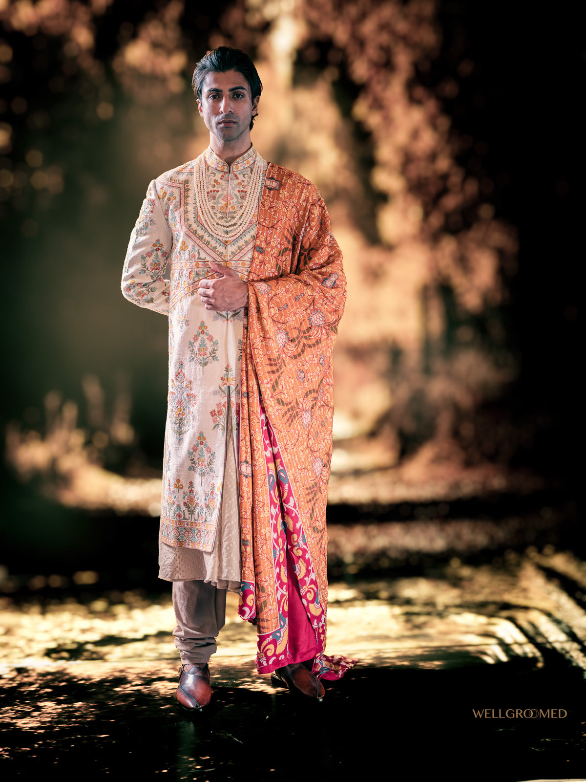 • Meticulously crafted from a luxurious silk blend, featuring intricate multicoloured threadwork with vibrant floral motifs for a regal and eye-catching look