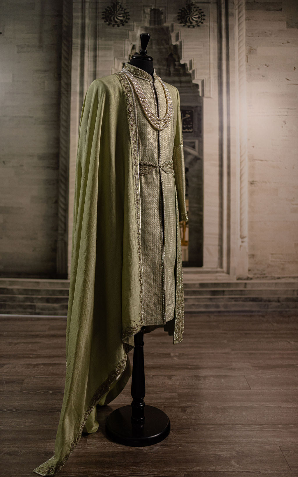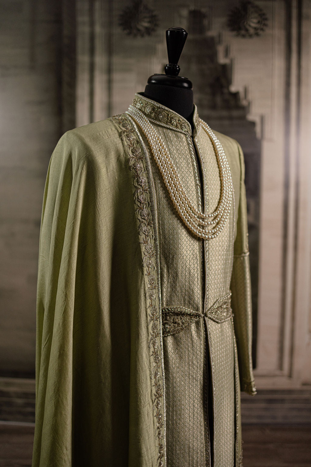 Make a bold statement with our Green Shervani with Cape, designed for the modern groom who values tradition with a contemporary twist. The rich green fabric is complemented by a stylish cape, adding an element of regal sophistication and grandeur. Crafted with attention to detail, this ensemble offers both comfort and a distinguished look, perfect for your special day. Fully customizable, it allows you to personalize every aspect, ensuring a perfect fit and a style that is uniquely yours.