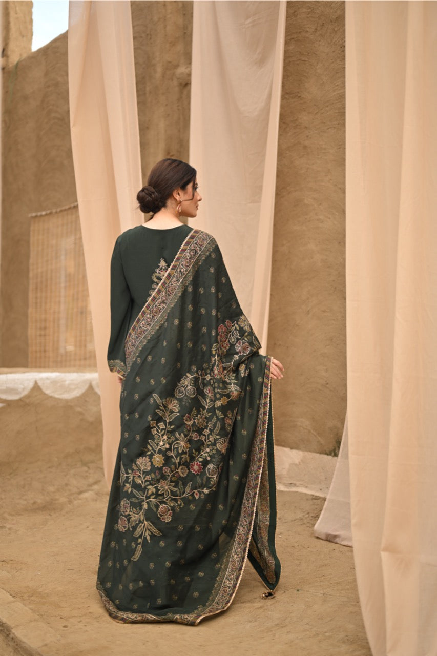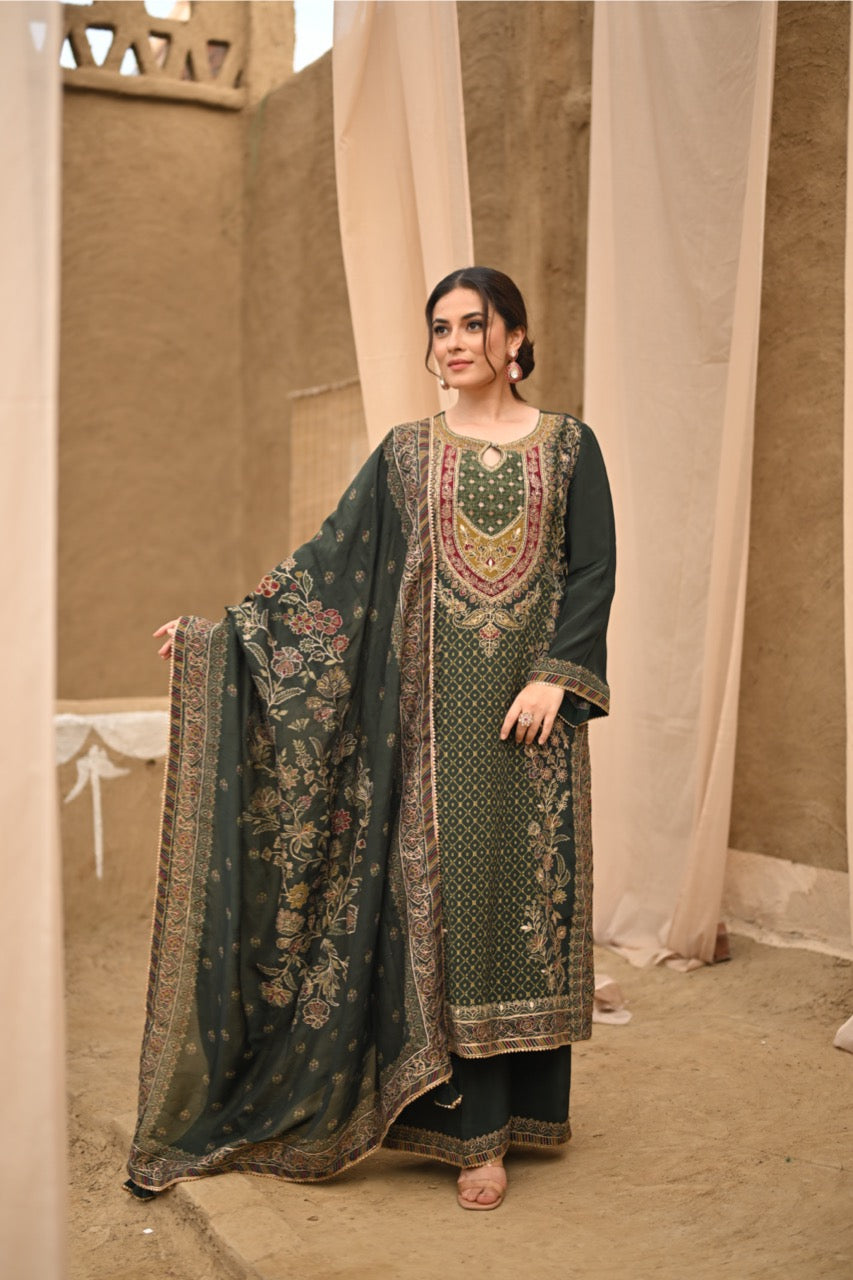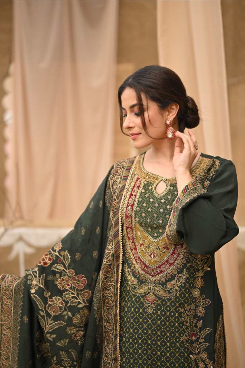 Dark green Indian suit, showcasing intricate gold and floral embroidery. This luxurious ensemble seamlessly blends rich hues with meticulous craftsmanship, making it a stunning choice for any occasion