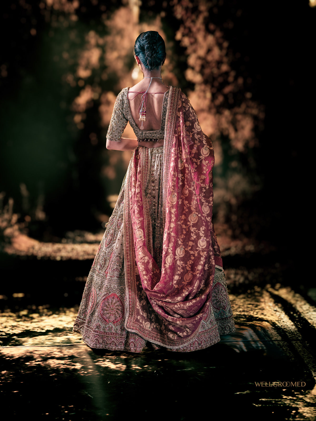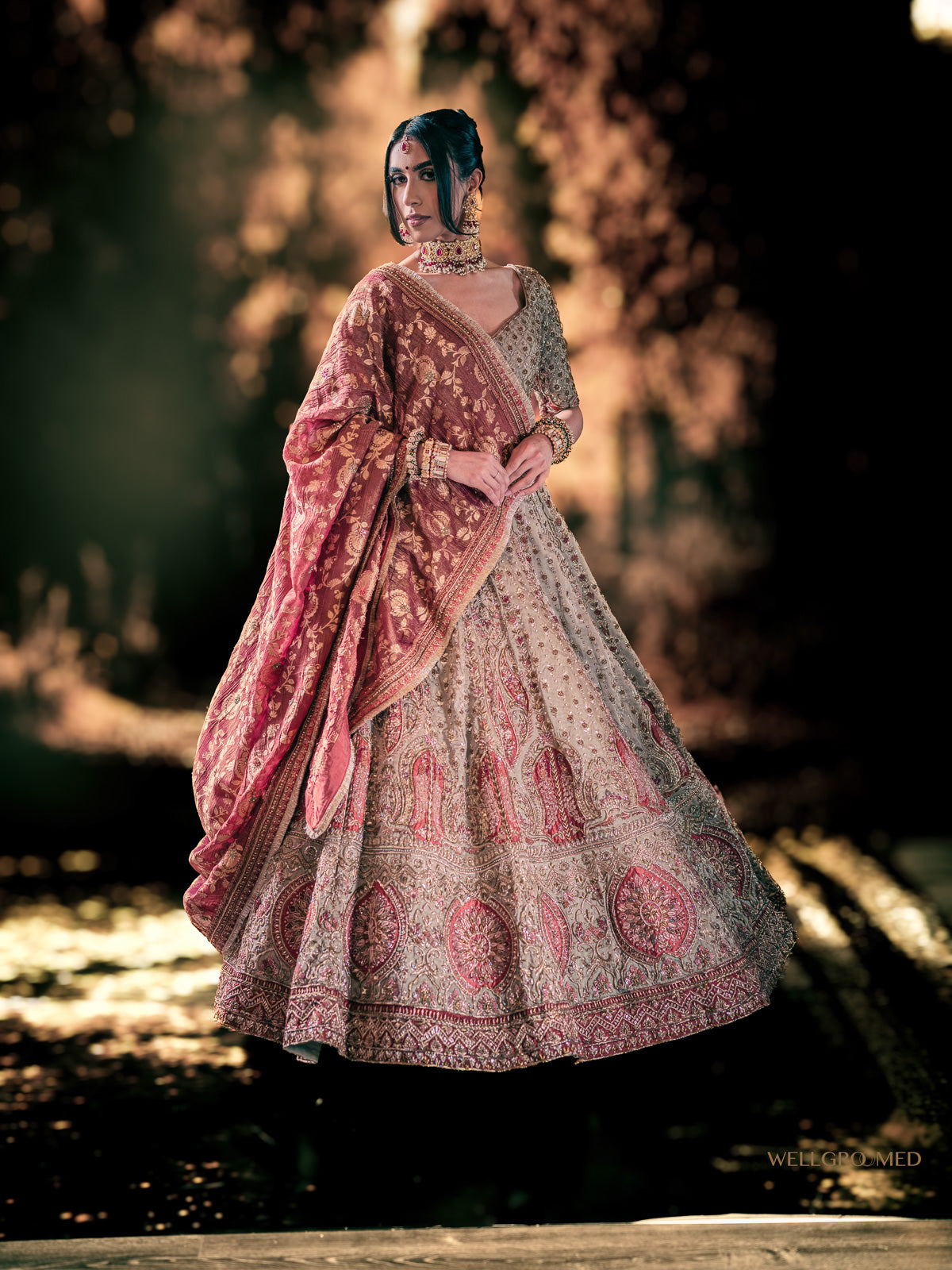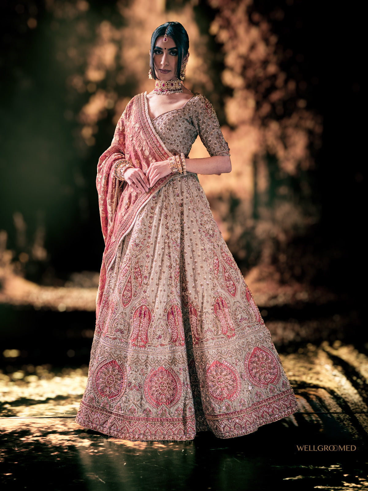 This graceful beige Lehenga features intricate floral motifs that exude timeless elegance and sophistication.
