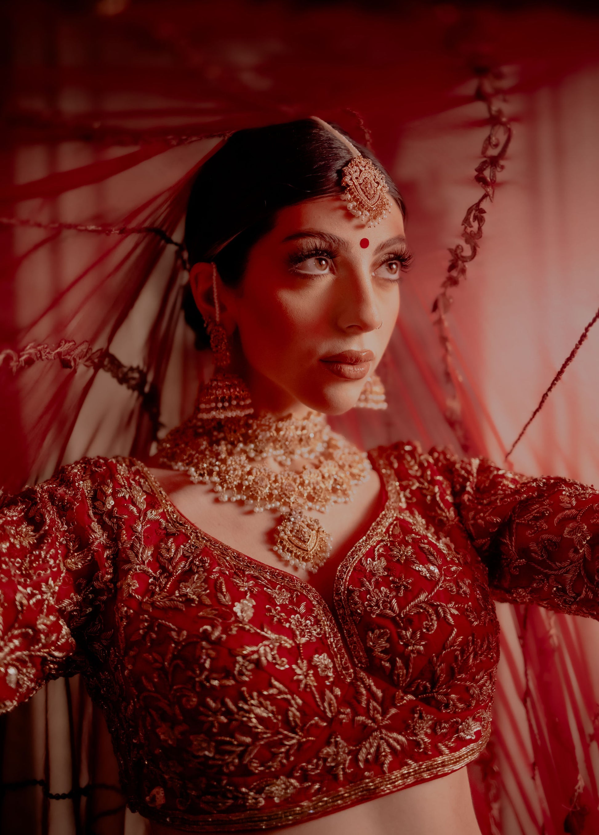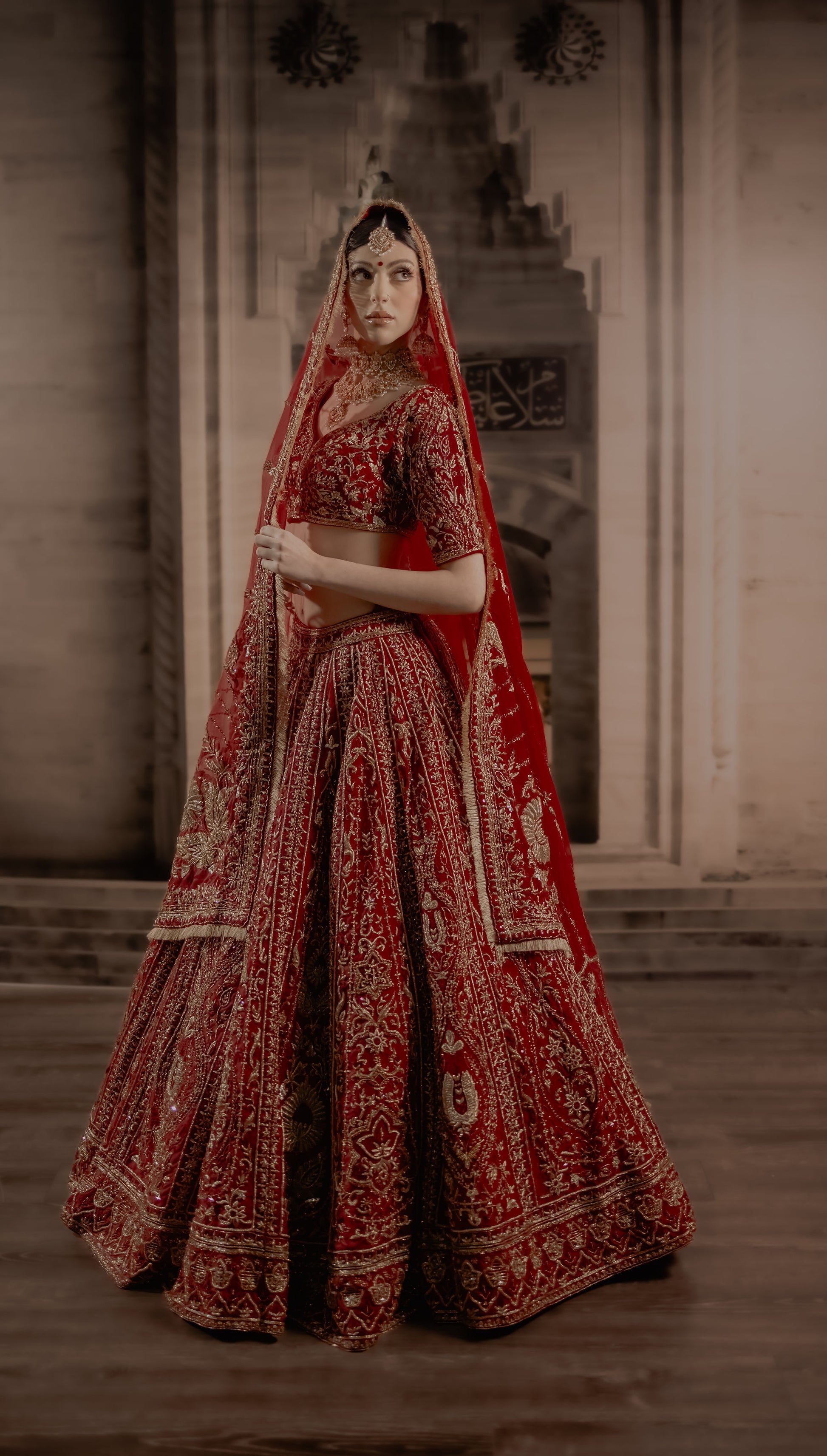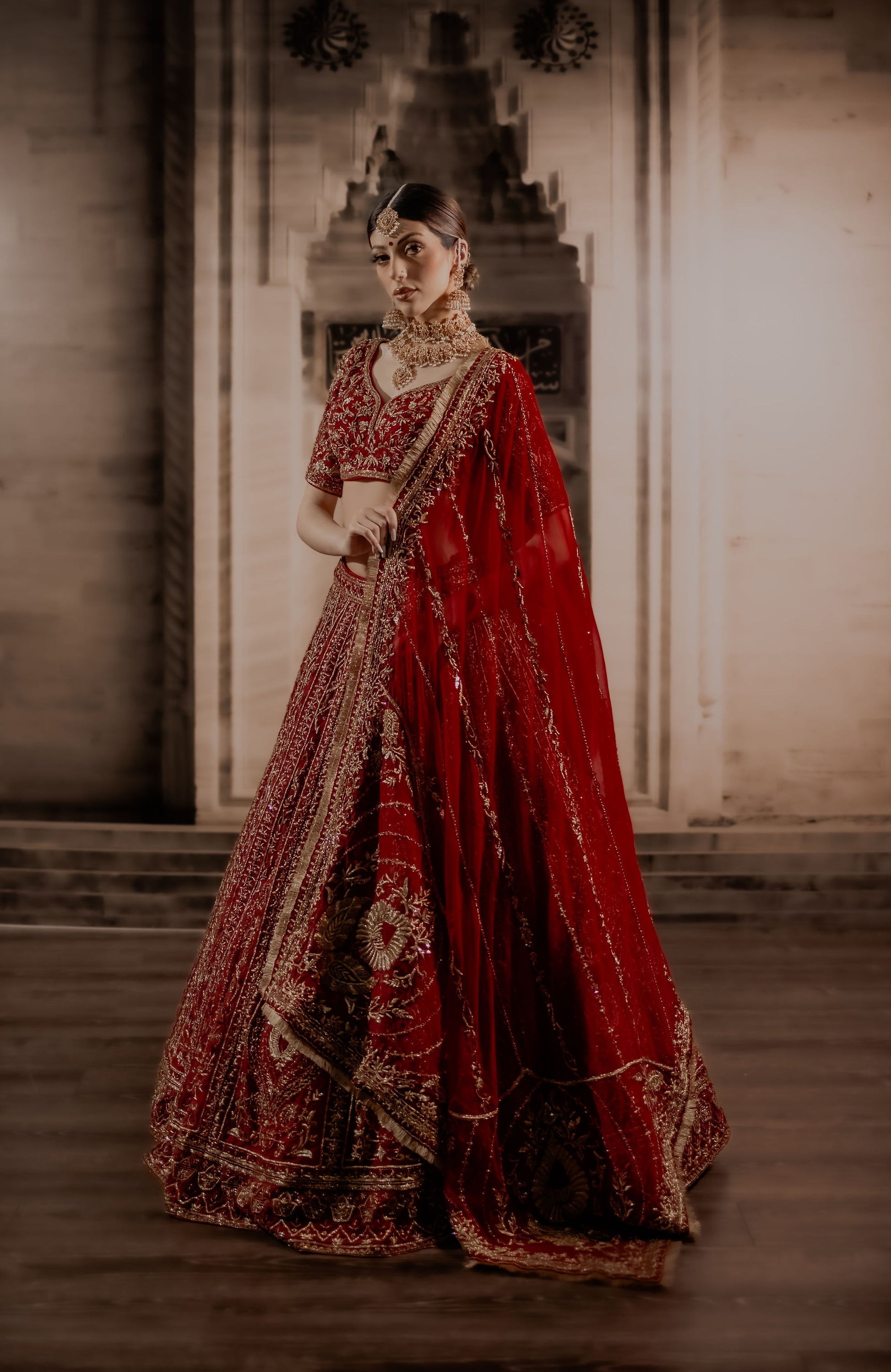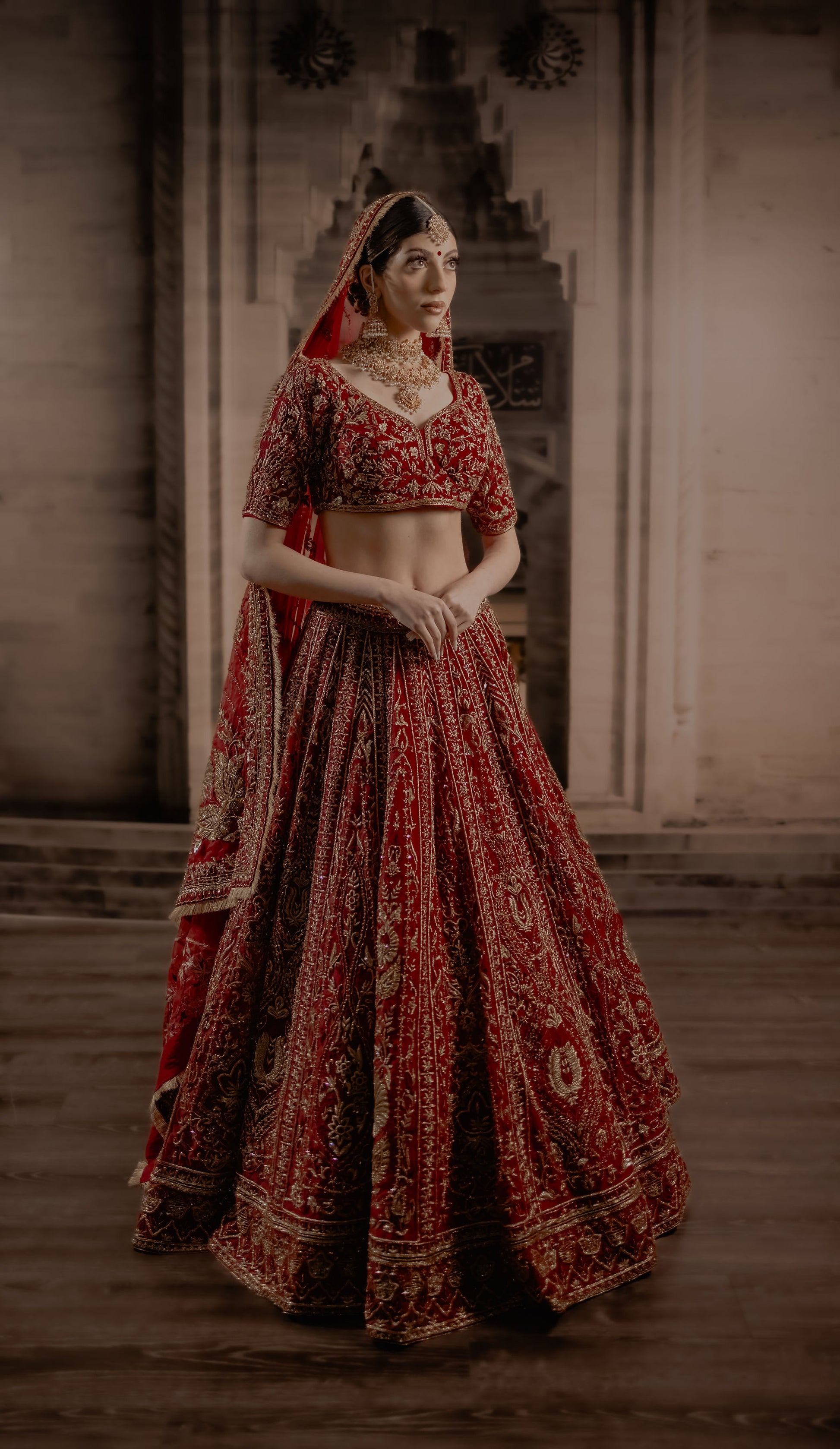 Step into the spotlight on your special day with our breathtaking Red Bridal Lehenga, meticulously crafted to make you the epitome of elegance and grace. This stunning ensemble features rich red organza fabric adorned with intricate gold embroidery, exuding timeless charm and regal sophistication.
