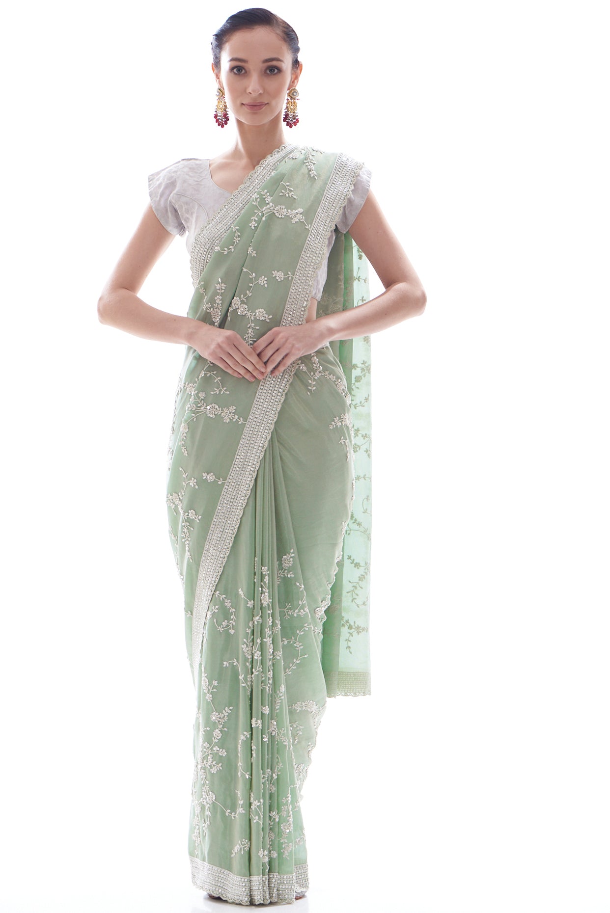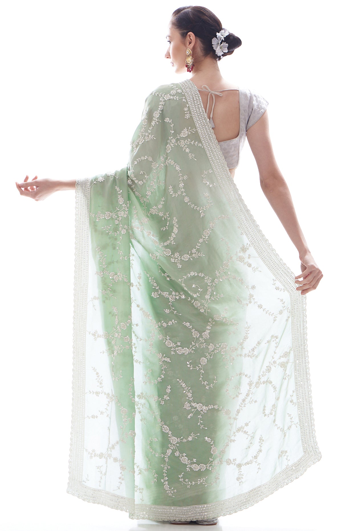 Aqua Saree In Organza Base With Zardosi And Sequins Embellishments. It Is Paired With A Matching Unstitched Blouse Piece.