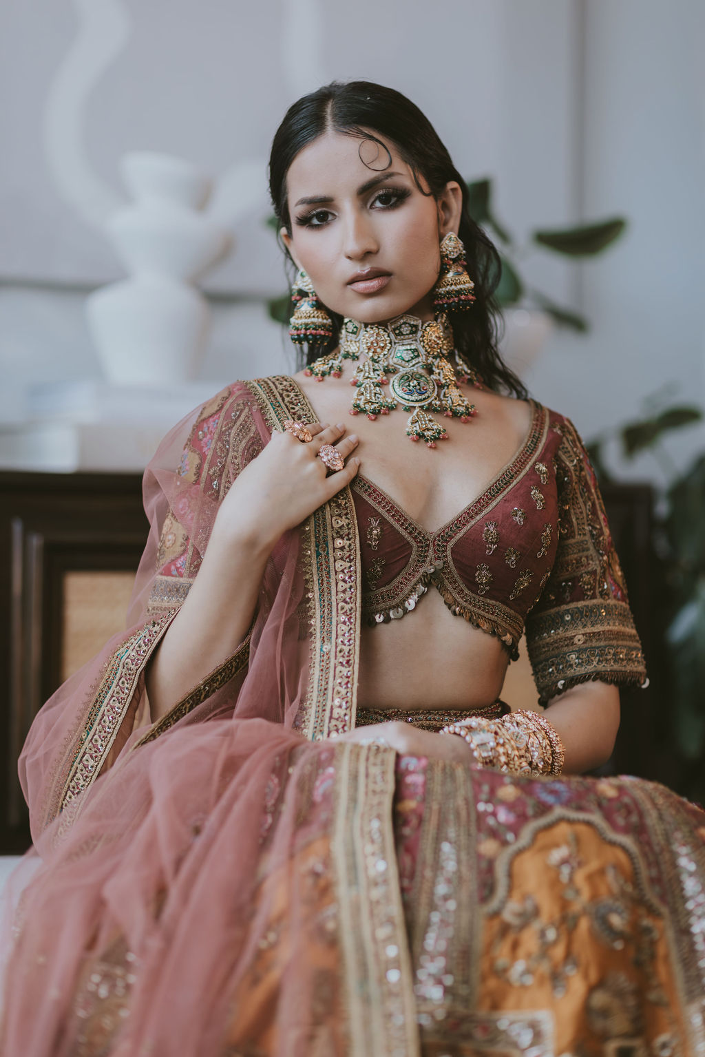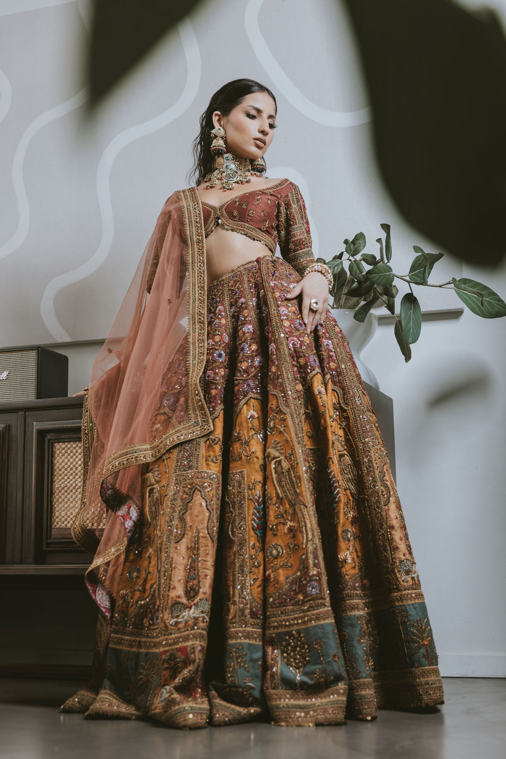 Step into elegance with our exquisite multicoloured bridal Lehenga in rich brown and mustard yellow, crafted from luxurious raw silk and adorned with intricate floral embroidery. This stunning ensemble blends vibrant hues with timeless artistry. Each Lehenga is fully customizable, ensuring a flawless fit and design tailored to your unique style.