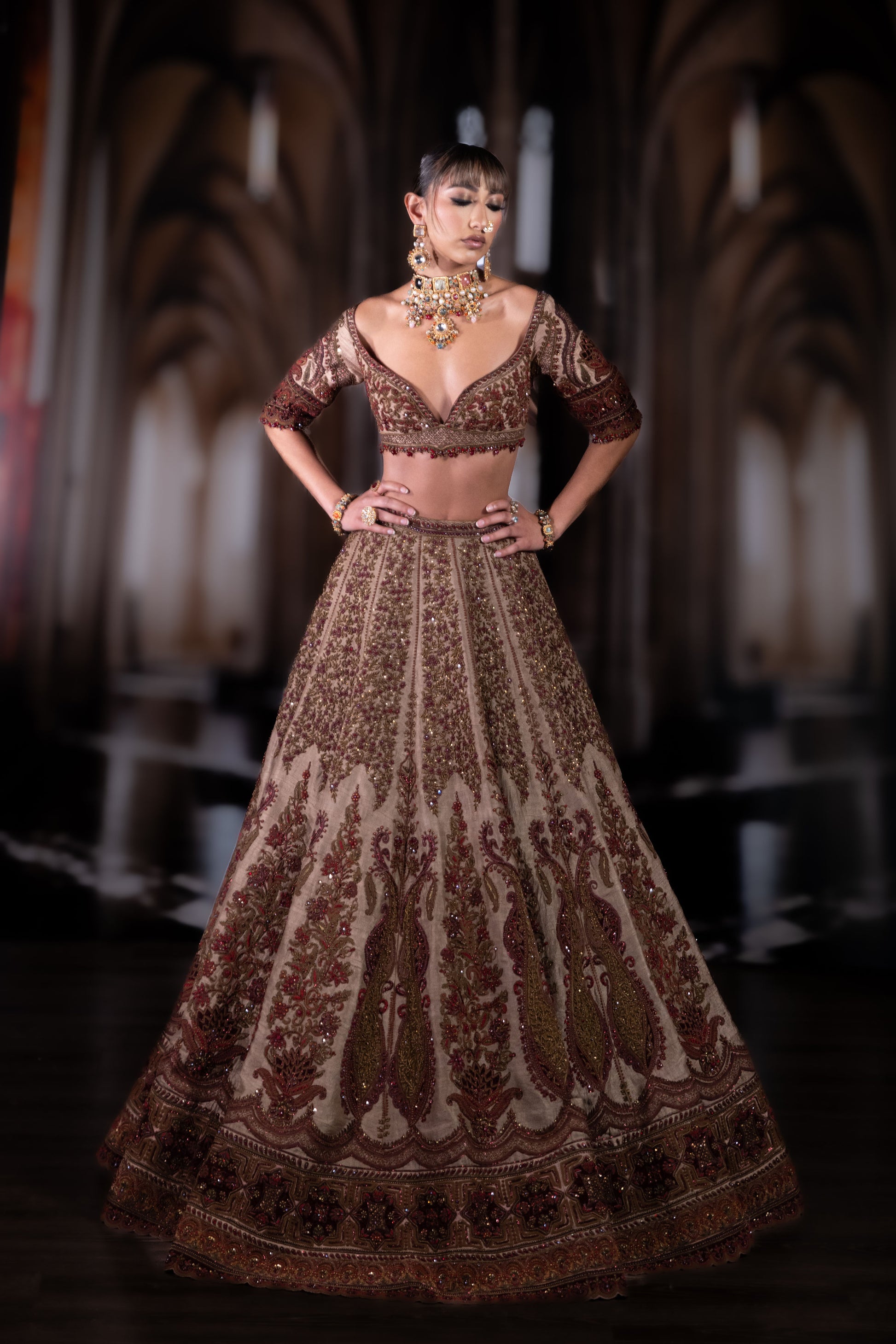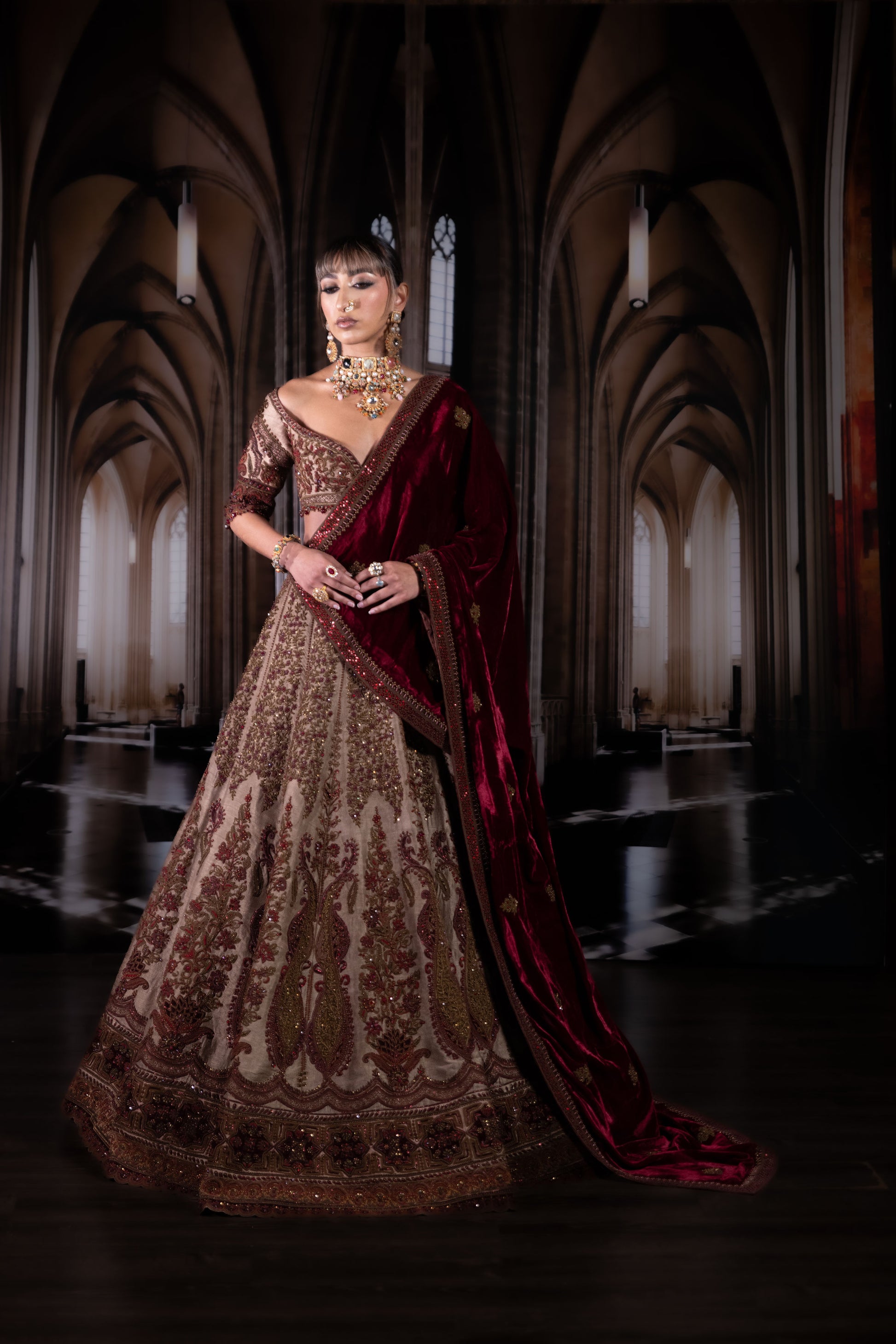 This exquisite taupe lehenga is a masterpiece of handwork and zardozi embroidery, featuring intricate floral and paisley motifs enriched with sequins, beads, and threadwork. The deep gold and maroon hues exude vintage grandeur, while the elaborate blouse, with delicate zardozi detailing, adds a regal touch. A luxurious maroon velvet shawl, adorned with embroidered borders and floral accents, enhances its elegance. This ensemble is a timeless blend of heritage craftsmanship and modern sophistication.