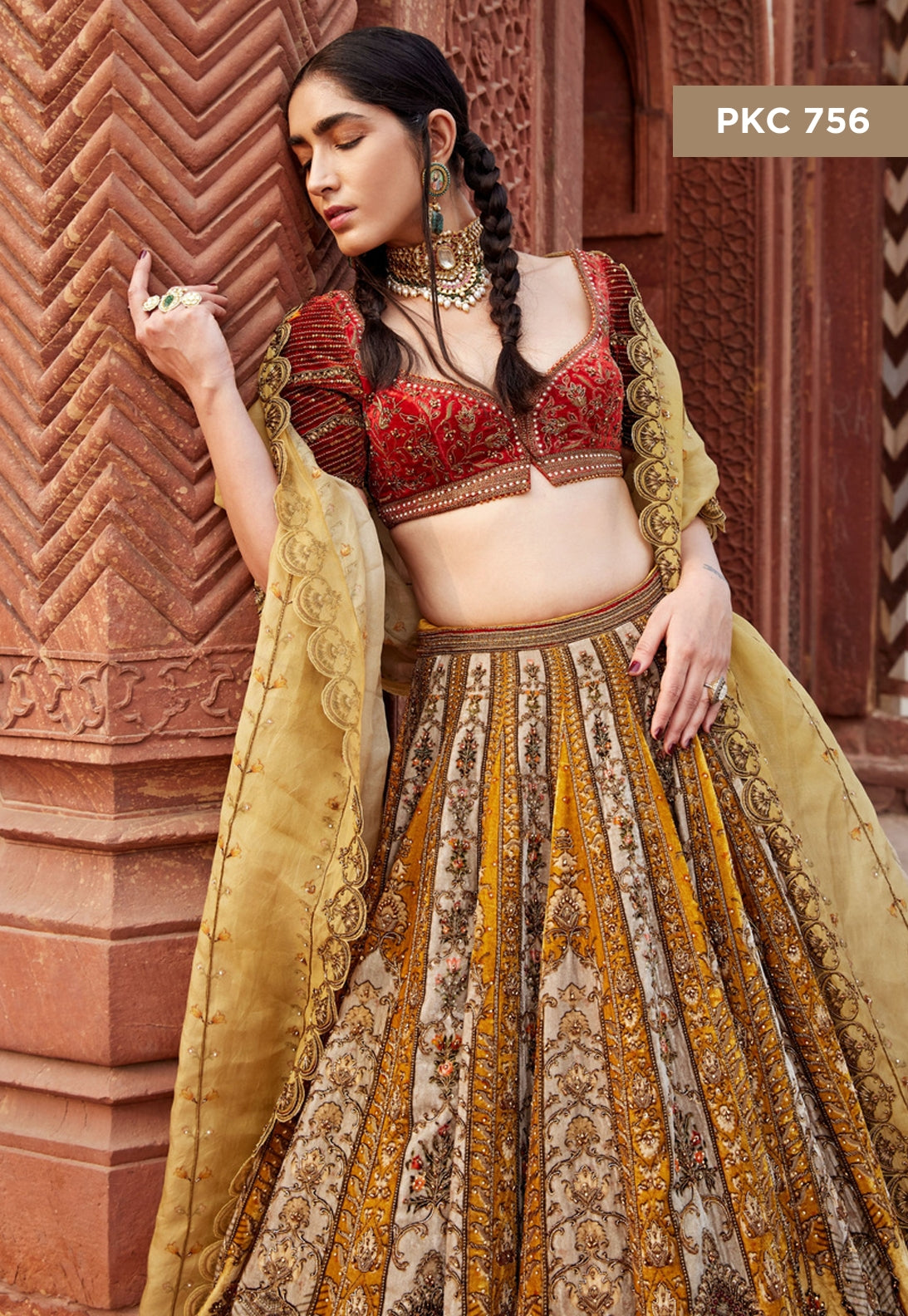 Illuminate your special day with our Mustard Yellow Embroidered Bridal Lehenga, paired with a striking red blouse. The rich mustard yellow fabric is adorned with intricate embroidery, creating a warm, regal feel, while the bold red blouse adds a vibrant contrast, making this ensemble a true statement of elegance and tradition.