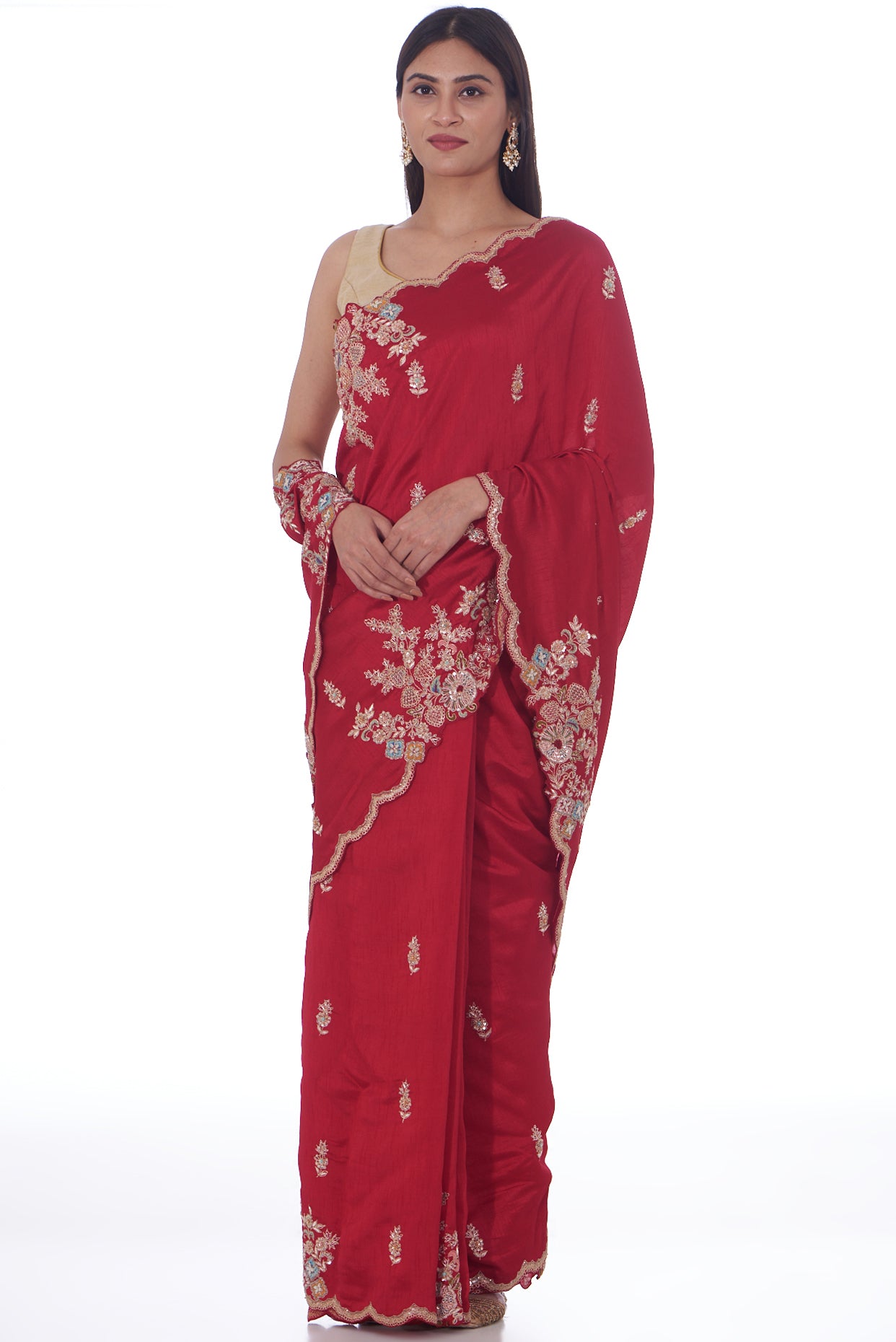 Red Saree In Tissue Organza Base With Sequins And Boota Work, Including A Scalloped Border. It Is Paired With A Matching Unstitched Blouse.