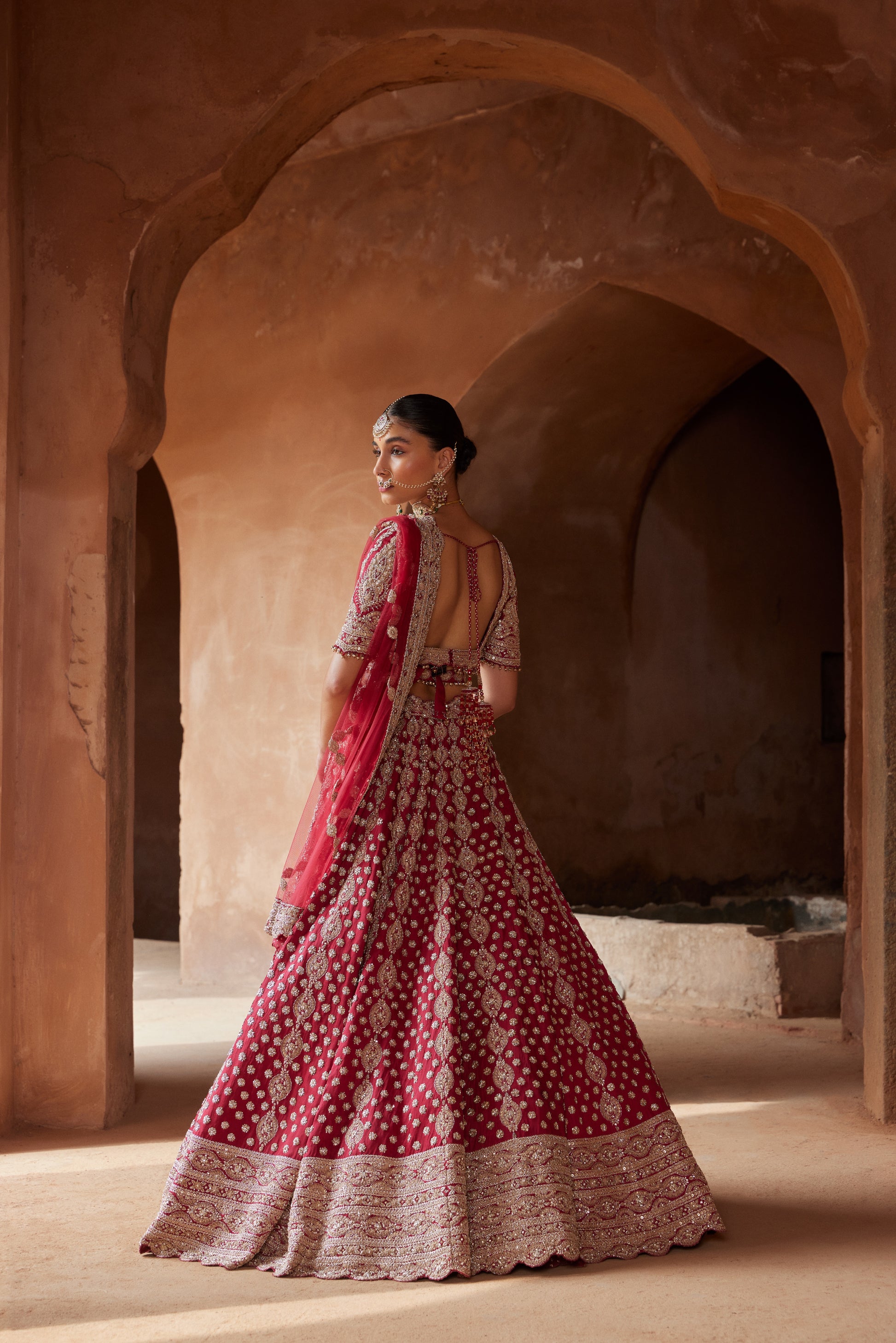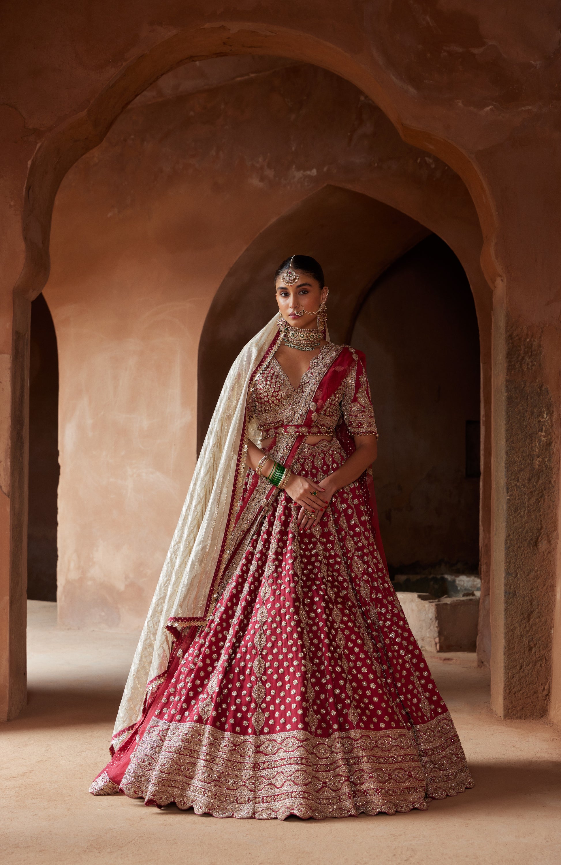 Indulge in timeless beauty with this maroon raw silk lehenga choli set, enhanced by a finely crafted belt and a graceful net dupatta. Adorned with delicate zardozi embroidery featuring dabka, shimmering sequins, intricate beadwork, and sparkling crystals, this ensemble radiates elegance. Elevate your bridal look with the optional second dupatta, crafted from luxurious gold-striped Banarasi tissue fabric, adding a regal touch to your special day. Perfect for the bride who desires sophistication with a hint of tradition.