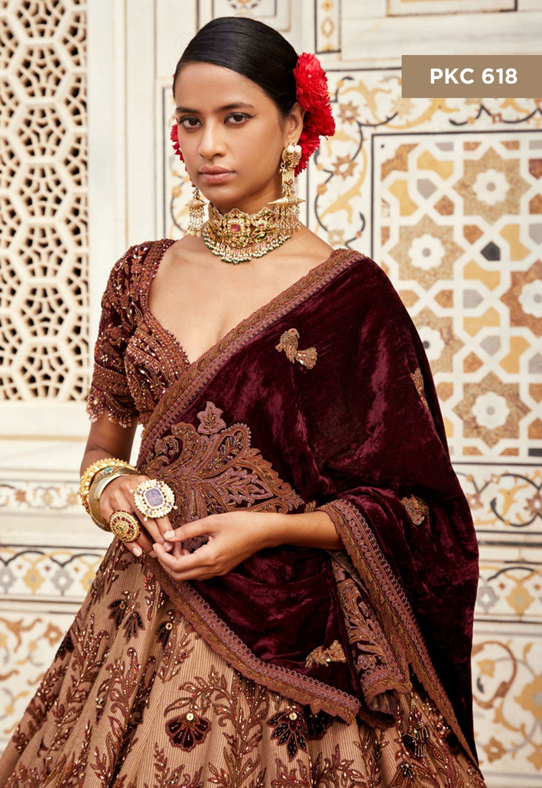 Embrace understated elegance with our Brown Bridal Lehenga, featuring delicate floral embroidery that adds a touch of romance and tradition. The rich brown hue exudes warmth and sophistication, while the intricate floral patterns bring a sense of timeless beauty to this luxurious piece. Crafted with care and attention to detail, this lehenga is perfect for the bride who seeks a refined yet striking look. Celebrate your special day with a piece that radiates natural beauty, grace, and a connection to the earth’s elegance.