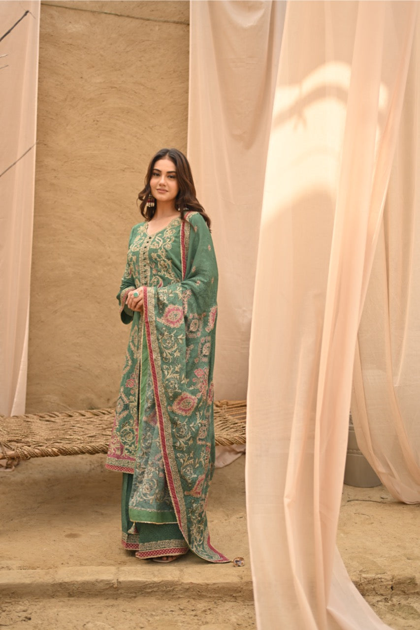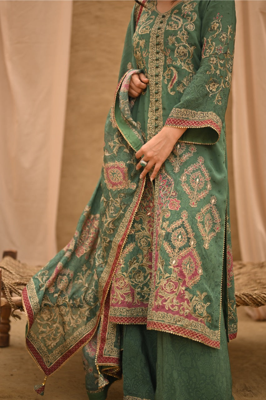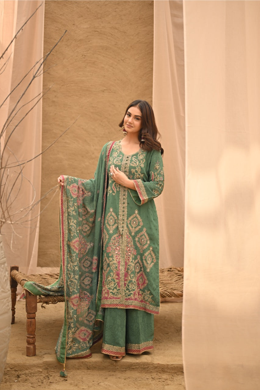 Elevate your elegance with this stunning green suit, beautifully embellished with intricate gold and red embroidery. The rich green fabric exudes sophistication, while the detailed embroidery adds a touch of tradition. Perfect for festive occasions or weddings, this suit offers both style and comfort, making it a must-have for your wardrobe.