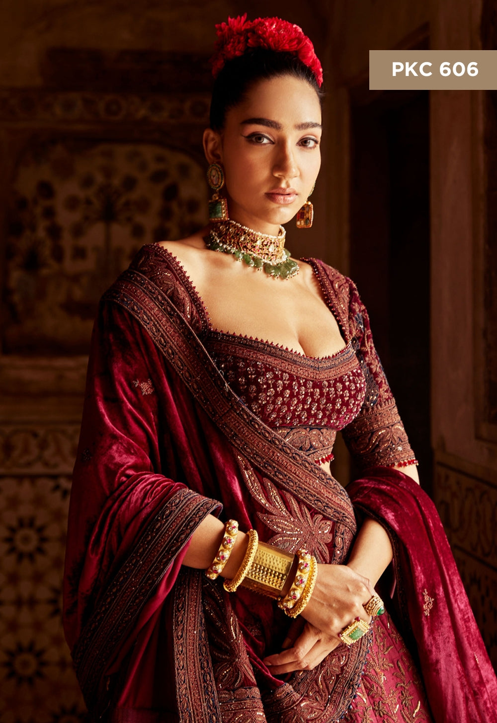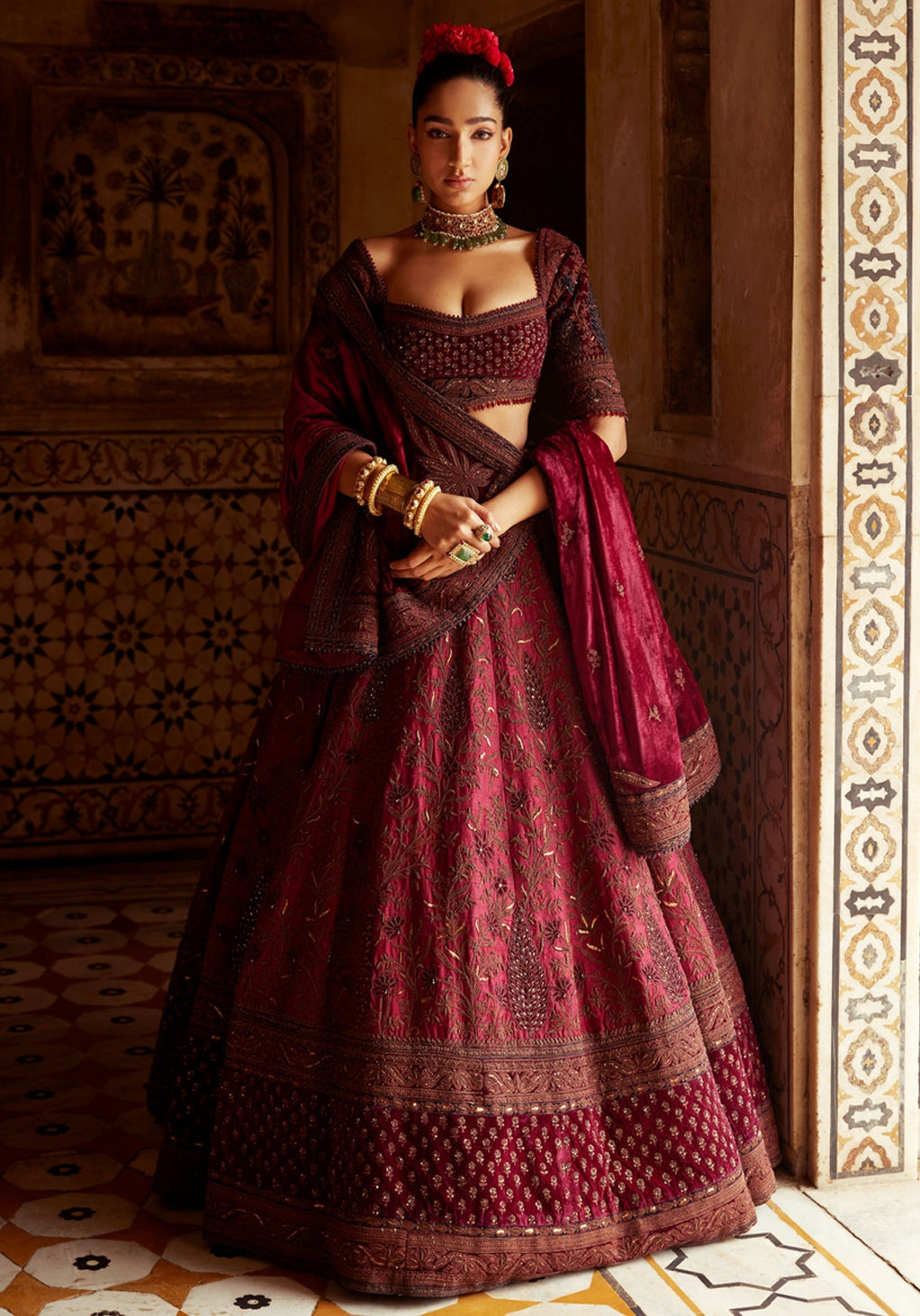 Discover understated luxury with our Maroon Tone-on-Tone Bridal Lehenga. The rich maroon hue is enhanced by intricate, subtle tonal patterns that add depth and sophistication to the design. Crafted with exquisite detail and luxurious fabric, this lehenga offers a refined and timeless look for the bride who appreciates elegance in simplicity. Perfect for a modern yet classic bridal look, this lehenga embodies beauty and grace, making it the ideal choice for a wedding day that radiates quiet sophistication and effortless charm.