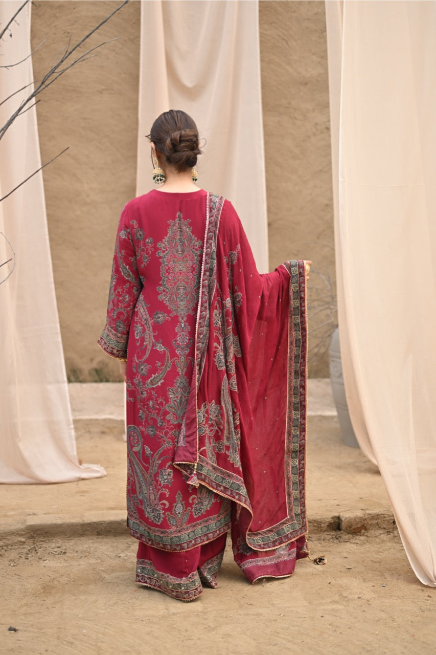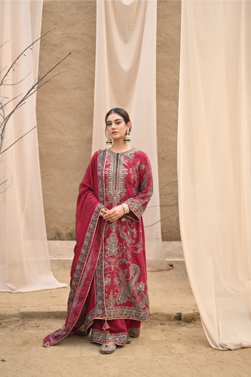 Vibrant red Indian suit, designed to make a statement. This stunning ensemble features a captivating floral print that radiates elegance and charm, perfect for any festive occasion or celebration.