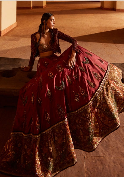 Renaz is a luxurious choice for the fashion-forward individual. Made with raw silk, this dark red lehenga boasts intricate detailing with beautiful zardozi handwork, creating a unique and eye-catching design.