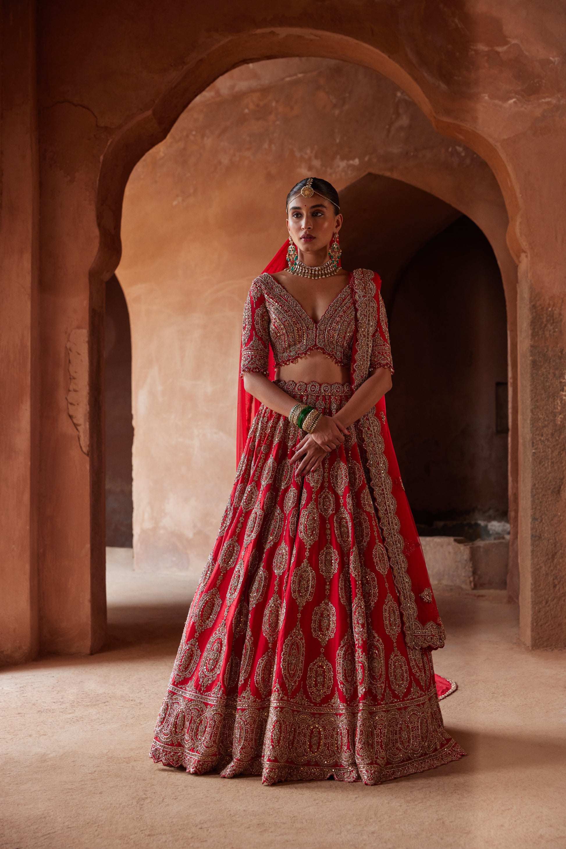 Make a bold statement with this scarlet red raw silk lehenga, paired with a gracefully embroidered net dupatta. Adorned with intricate dabka, kasab, sequins, beadwork, crystals, and delicate resham French knots, this ensemble is a true masterpiece of craftsmanship. Complete the look with an optional worked net head veil for an added touch of regal elegance. Designed for the bride who desires a harmonious blend of tradition and sophistication.