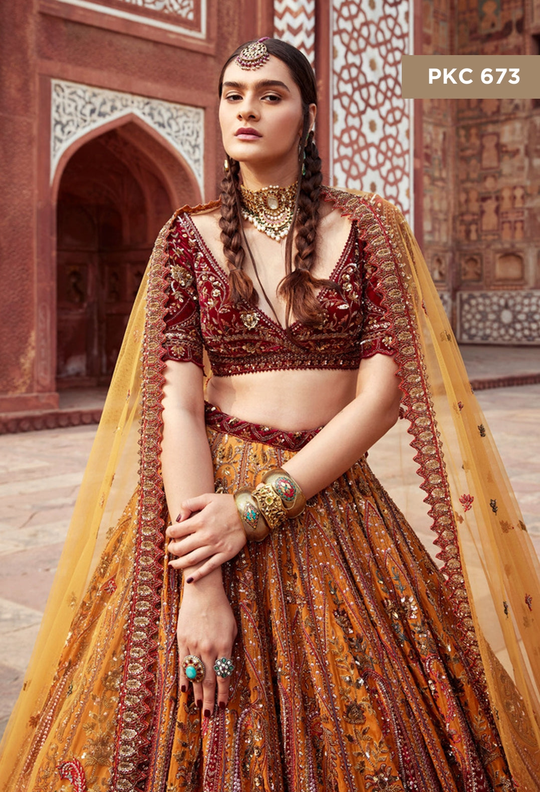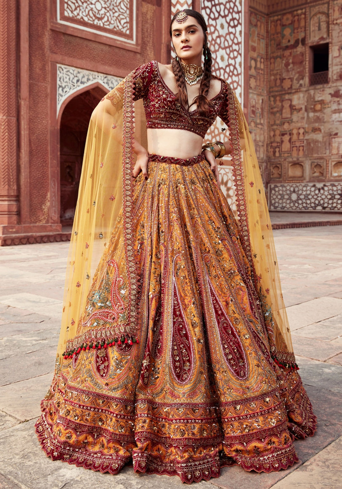 Radiate warmth and vibrancy with our Maroon and Orange Embroidered Bridal Lehenga, paired with a striking yellow dupatta. The rich maroon and orange hues come together in intricate embroidery, creating a dynamic and eye-catching design that exudes both elegance and energy. The yellow dupatta adds a touch of brightness, perfectly balancing the boldness of the lehenga.