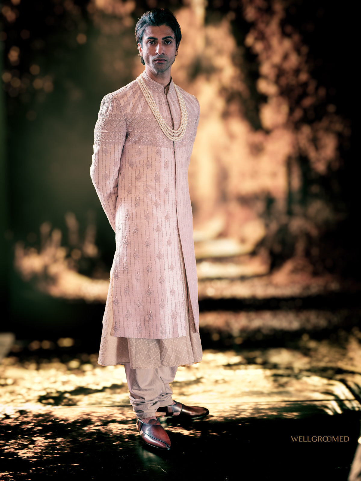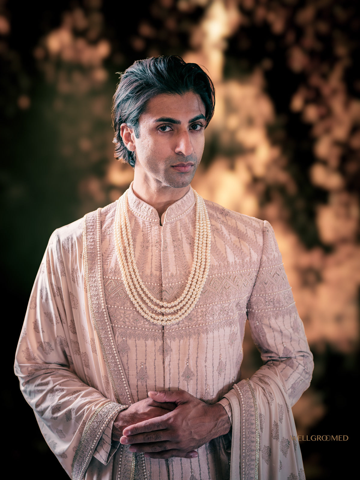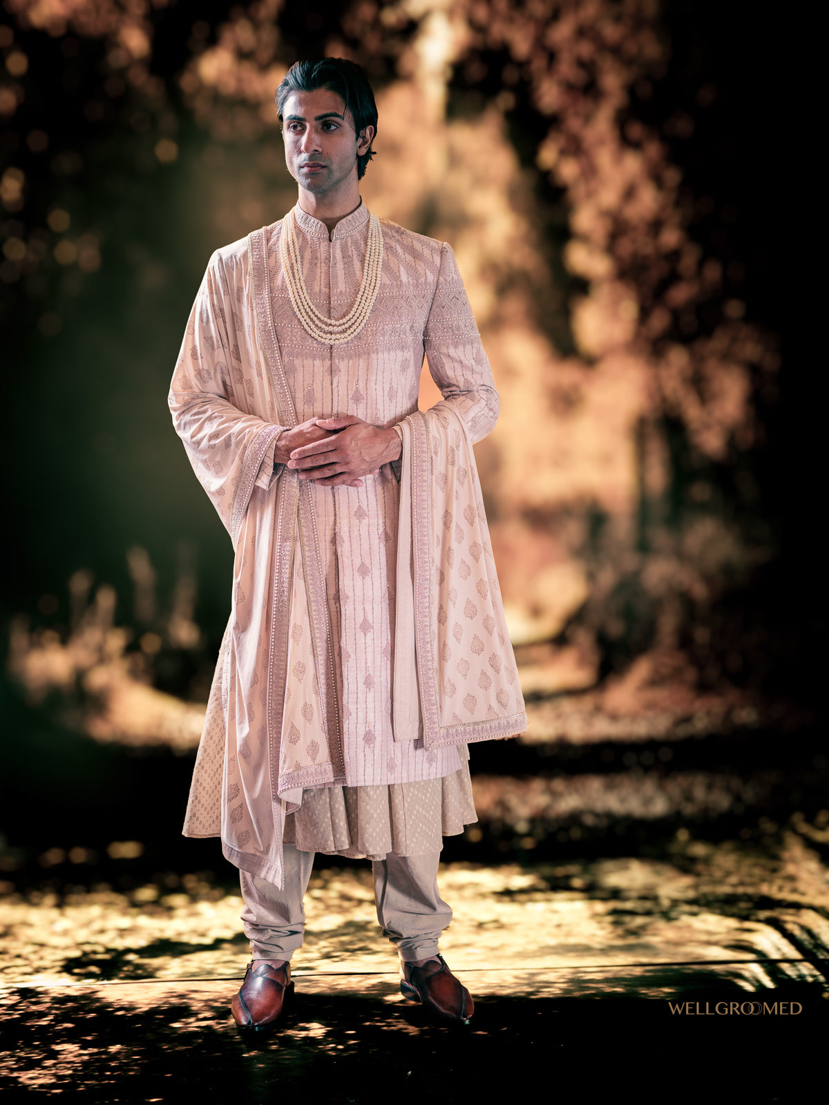 - Crafted from a luxurious silk base, featuring geometric Dori embroidery for an opulent and regal look
