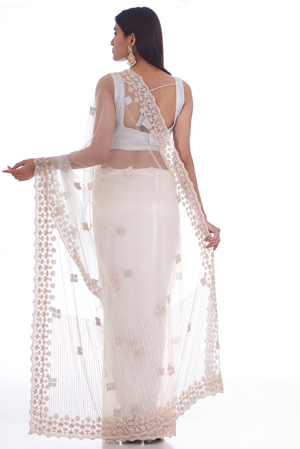 White Saree In Tissue Organza Base With Sequins And Boota Work, Including A Scalloped Border. It Is Paired With A Matching Unstitched Blouse.