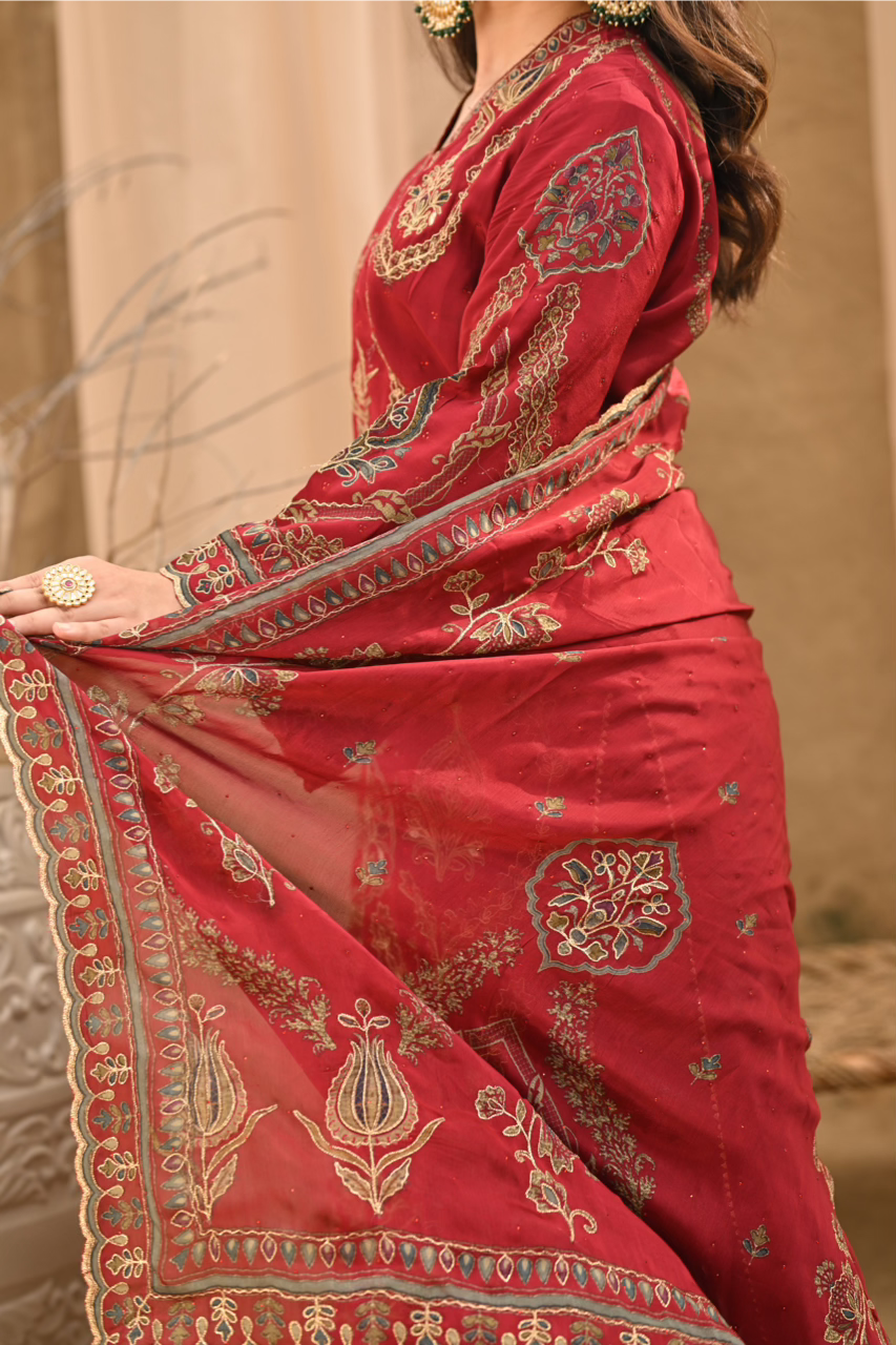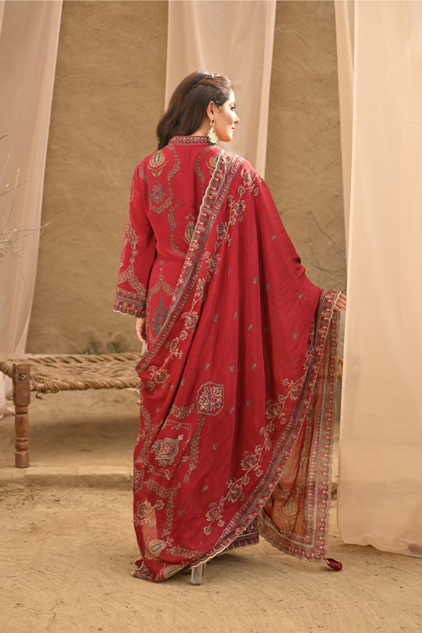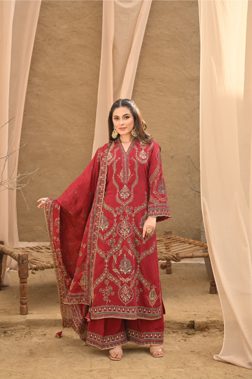 Embrace the essence of tradition with our stunning red Indian suit, designed to make a bold statement while honoring timeless craftsmanship. This exquisite ensemble features intricate floral embroidery, reminiscent of classic artistry, adding a touch of elegance and charm to your look. Crafted from luxurious fabric that drapes gracefully, it ensures comfort and style for any occasion, whether you're attending festive celebrations or intimate gatherings.