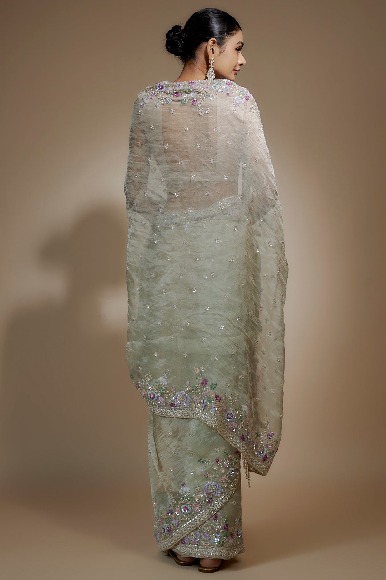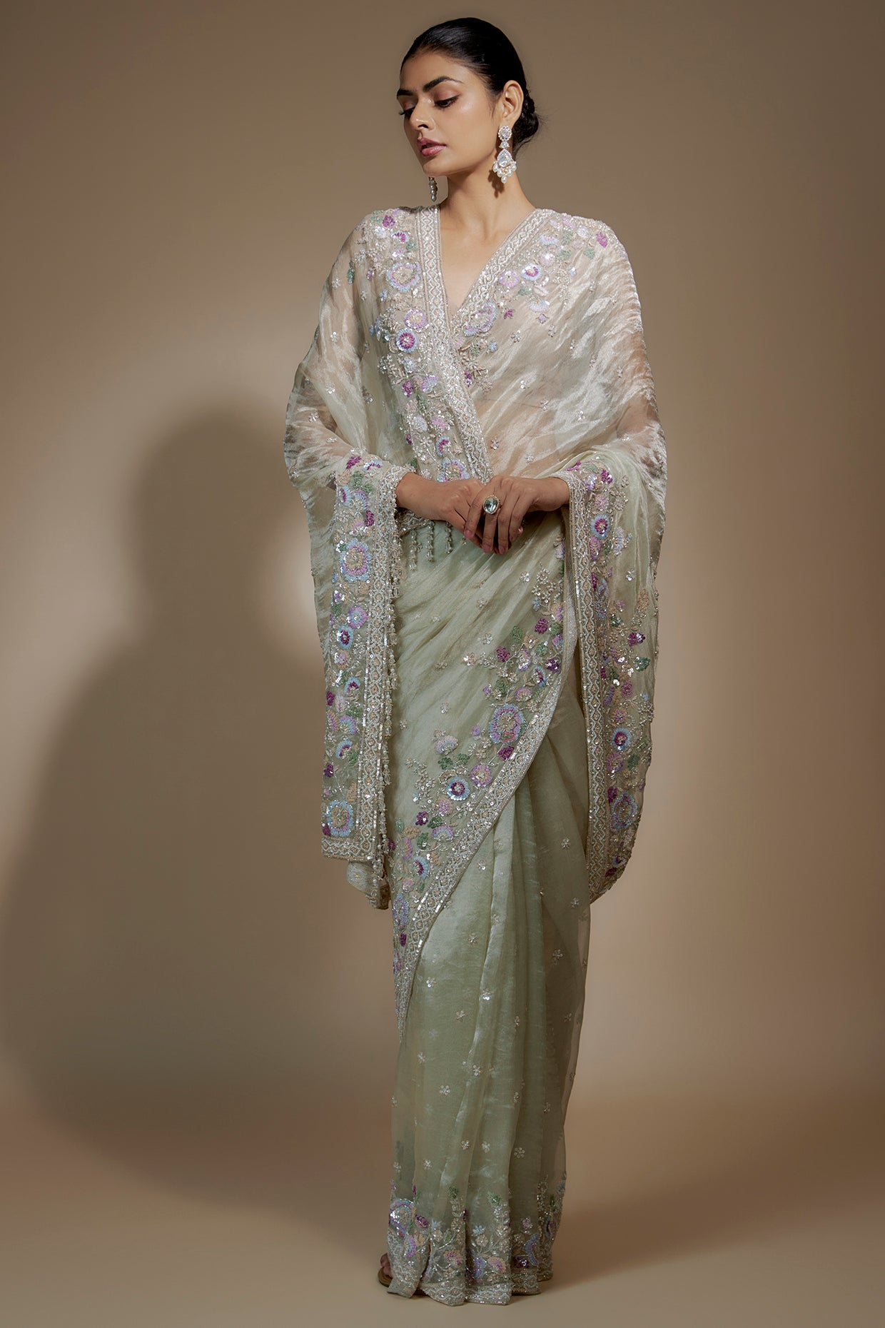 Mint Green Saree In Tissue Organza Base With Sequin Embellishments. It Is Paired With An Unstitched Blouse Fabric. Accentuate It With Statement Jewellery And Heels For A Wedding Or Engagement Ceremony.