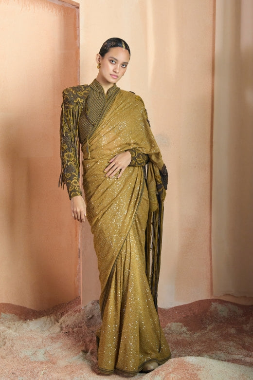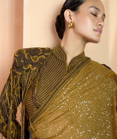 Radiate elegance in this glittery gold saree paired with a high-neck green blouse featuring shoulder caps. The sleek blouse is detailed with tight lines, intricate shoulder embroidery, and delicate tassels hanging down, adding a touch of refined sophistication. Perfect for any special occasion, this ensemble blends traditional charm with modern flair