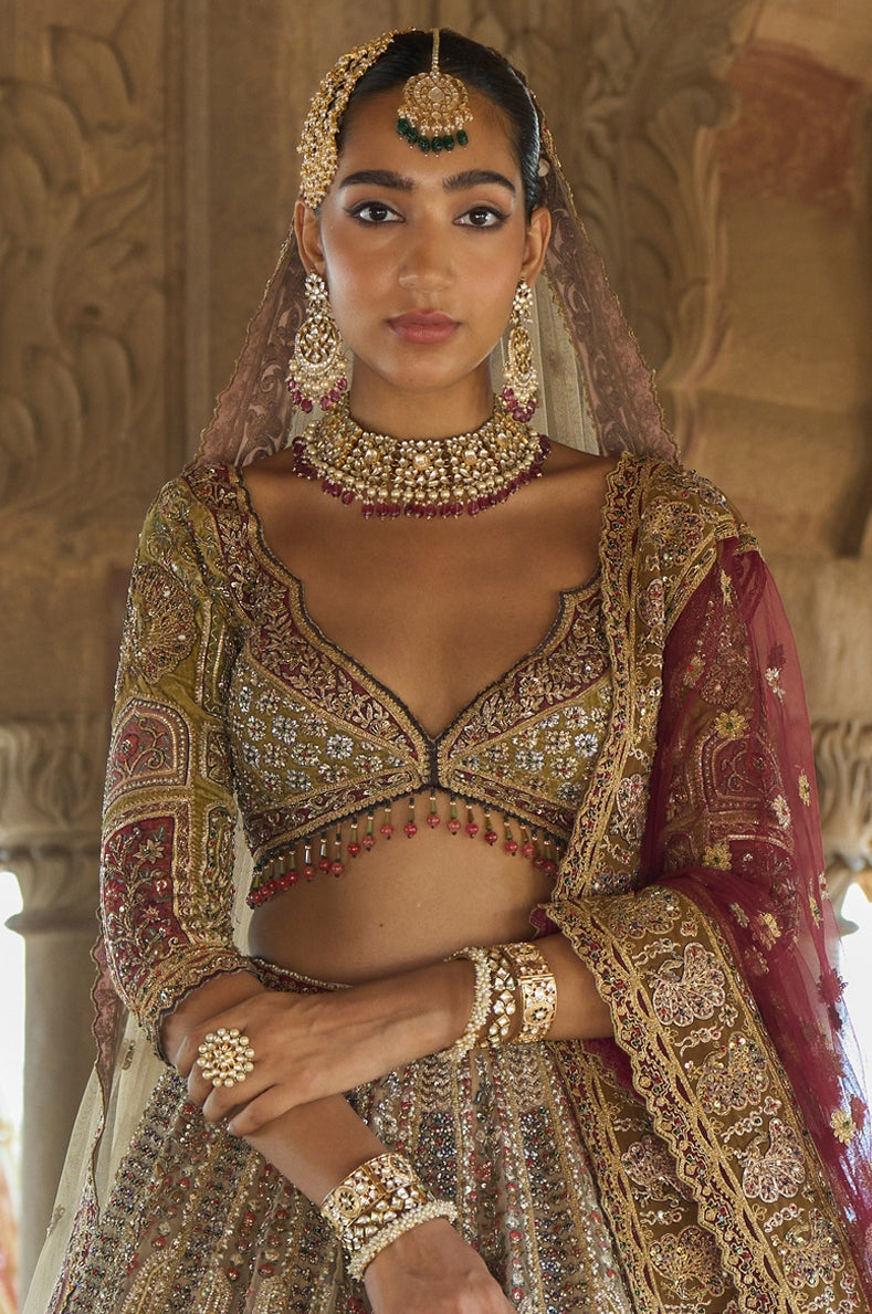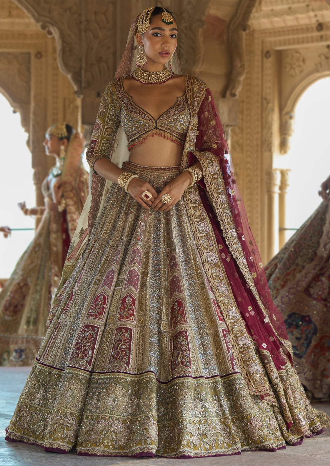 Step into timeless elegance with our Sage Green and Maroon Silk Bridal Lehenga. Featuring intricate architectural arches and delicate floral embroidery, this stunning piece marries tradition with modern artistry. The soft sage green and rich maroon hues create a striking contrast, symbolizing harmony and passion. Crafted from luxurious silk, this lehenga offers a regal, sophisticated look for the bride who wants to stand out with grace. Each detail reflects a blend of architectural beauty and natural elegance, making it the perfect choice for a bride seeking a truly unique and breathtaking ensemble.