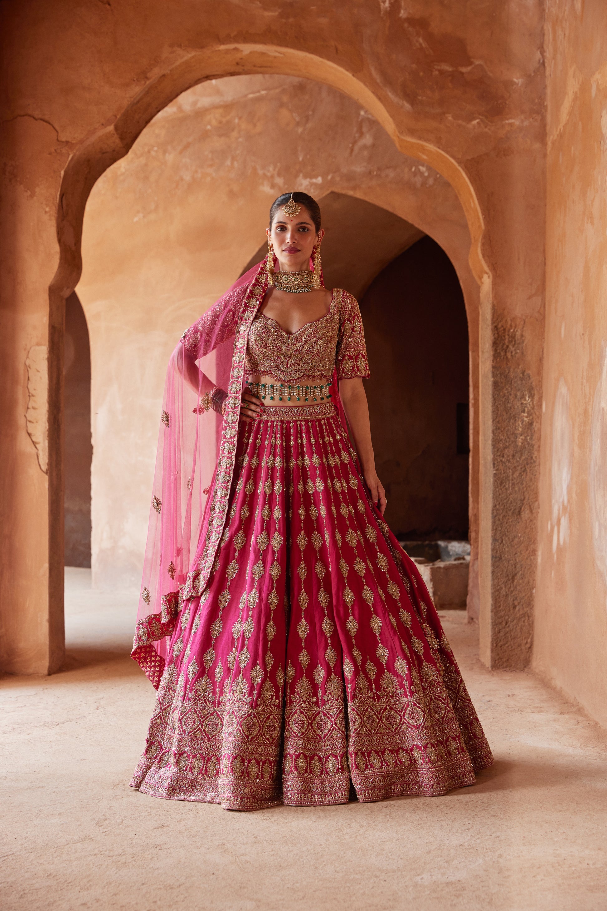 Step into the spotlight with this exquisite fuchsia red raw silk lehenga choli, paired with a delicately embroidered net dupatta. Featuring intricate craftsmanship with fine dabka, zari, shimmering sequins, beads, and dazzling crystals, this ensemble radiates timeless elegance and grandeur. A perfect choice for the bride who seeks vibrant sophistication and unmatched artistry on her special day.