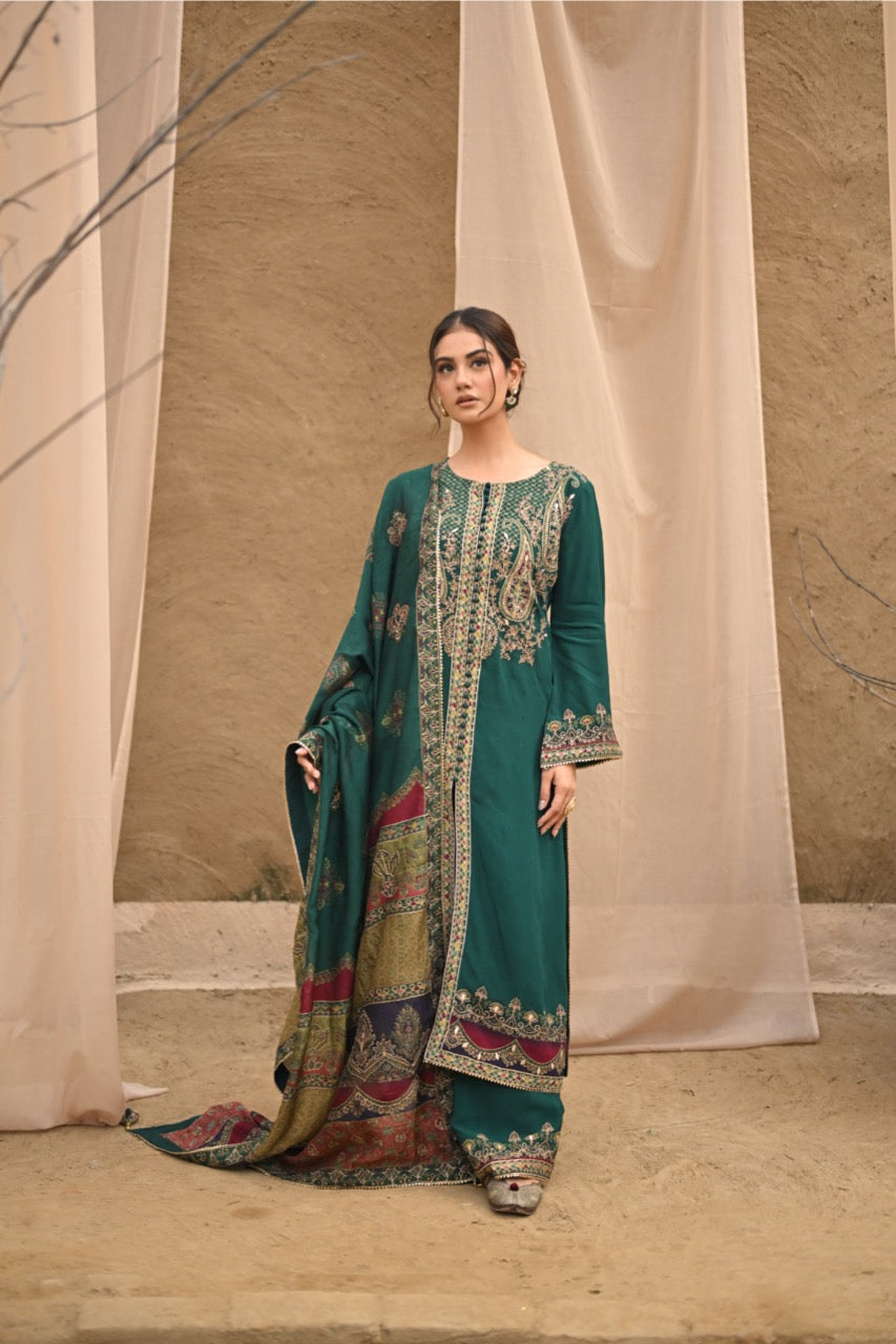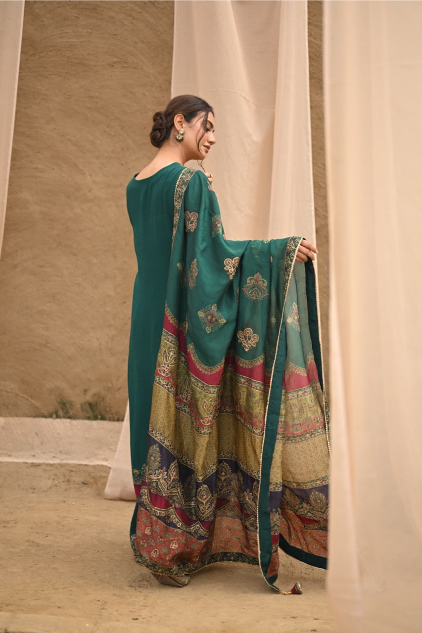 Exquisite bottle green Indian suit designed to capture attention. Made from premium fabric, this stunning ensemble features intricate embroidery that perfectly highlights its rich, vibrant hue. Ideal for festive celebrations or elegant gatherings, this suit seamlessly blends traditional craftsmanship with a modern touch.