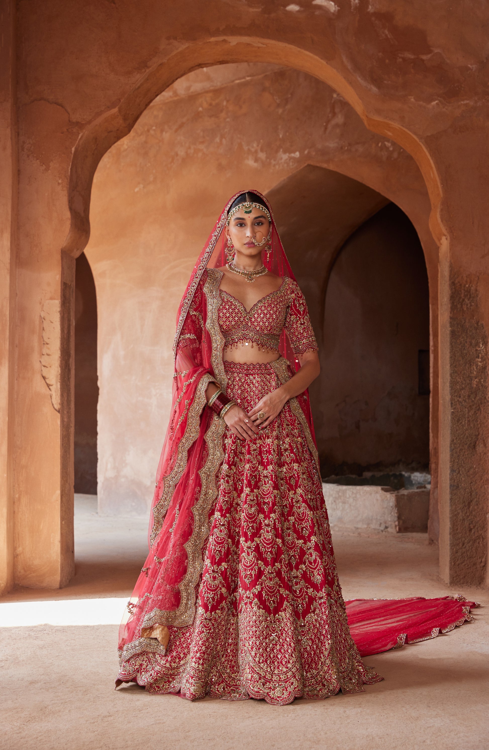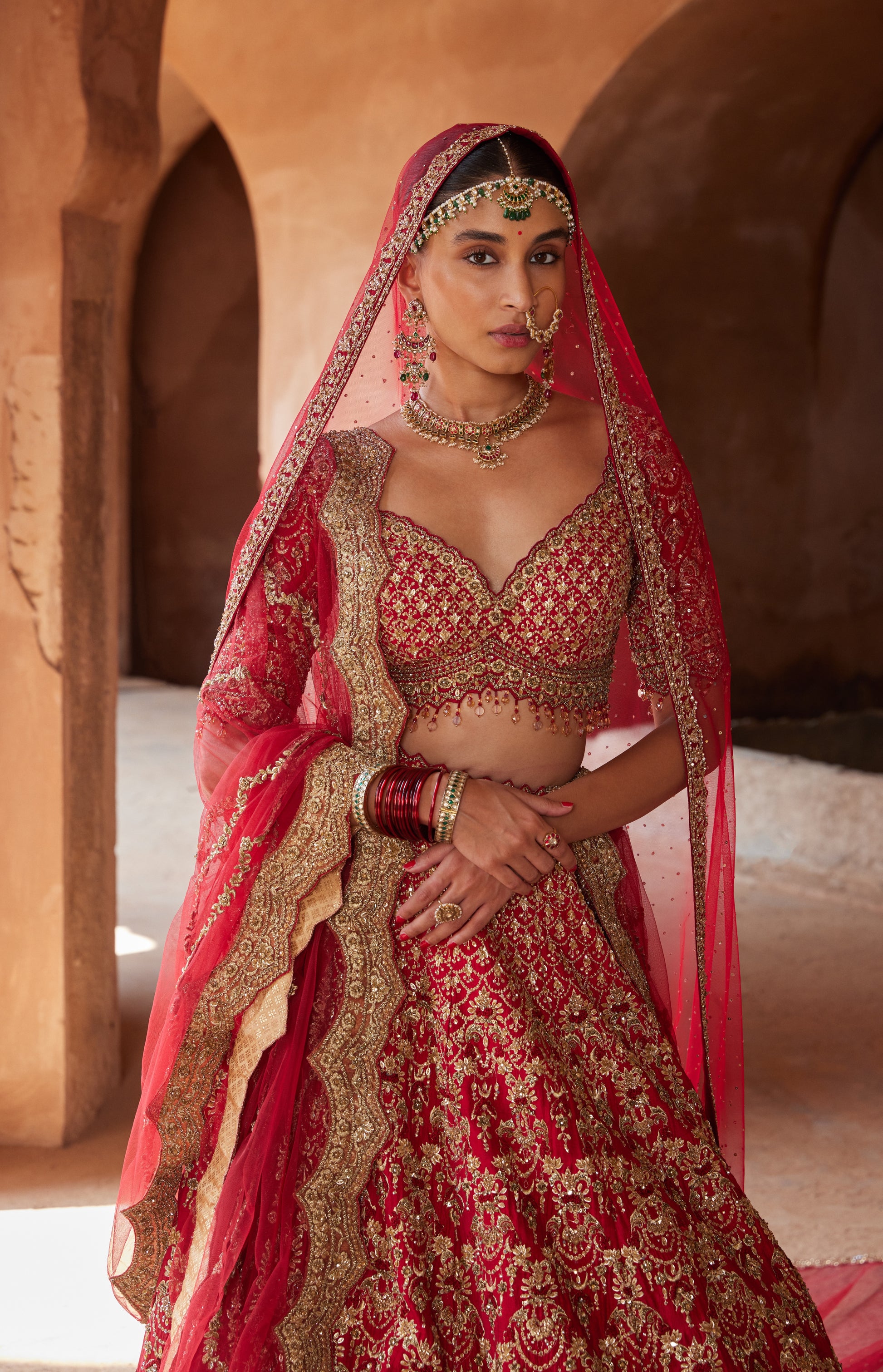 Make a regal statement in this blood-red raw silk lehenga choli, featuring a beautifully embroidered belt and a net dupatta. Showcasing a traditional jhoomar pattern, the intricate craftsmanship includes gold dabka, shimmering kasab, sequins, beadwork, and dazzling crystals. Elevate your bridal look with the option of an additional embroidered net head veil, adding a touch of timeless elegance and cultural charm to this opulent ensemble. Perfect for the bride who dreams of a timeless, majestic wedding day look.