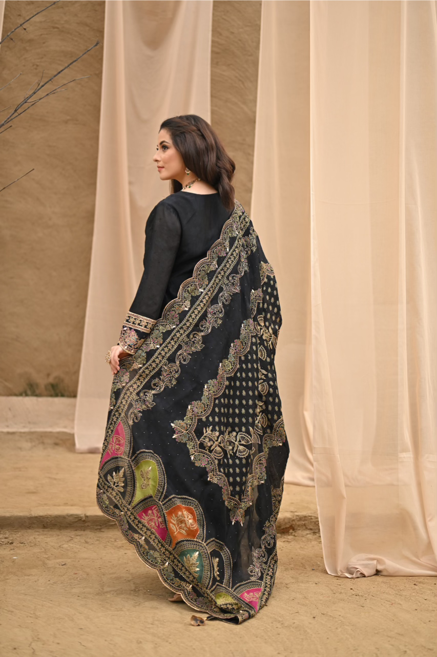 Black suit beautifully adorned with vibrant multicoloured embroidery that celebrates cultural artistry. This exquisite ensemble combines elegance and modern flair, making it perfect for any occasion. The rich black fabric serves as a striking backdrop for the intricate designs, creating a captivating visual experience. Whether you're attending a festive celebration or a chic evening event, this suit ensures you stand out with grace and confidence.