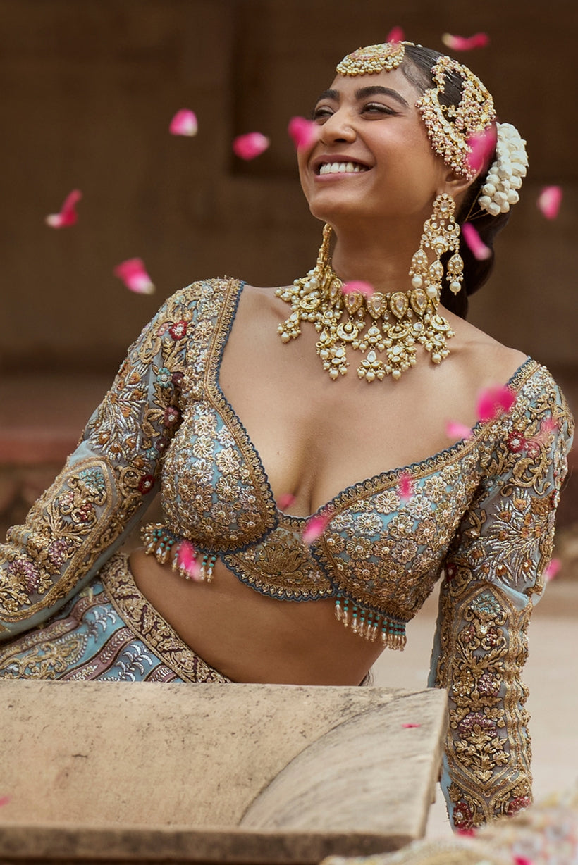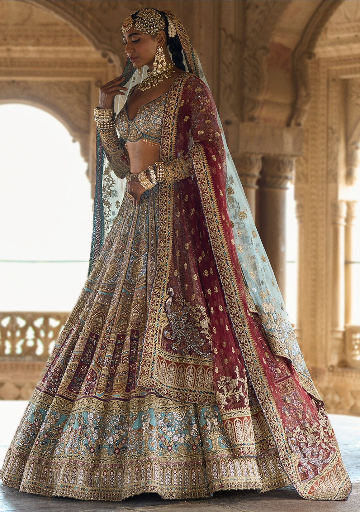 Unveil a striking blend of colors with our Bright Sky Blue and Deep Maroon Silk Lehenga. The rich maroon and vibrant sky blue hues create a bold yet harmonious contrast, while the intricate floral embroidery adds a timeless, feminine touch. Crafted from luxurious silk, this lehenga radiates opulence and grace, making it the perfect choice for a bride seeking both tradition and modern elegance. Step into your wedding day with a piece that captures beauty, passion, and sophistication in every stitch. A lehenga that promises to make you shine with every move.