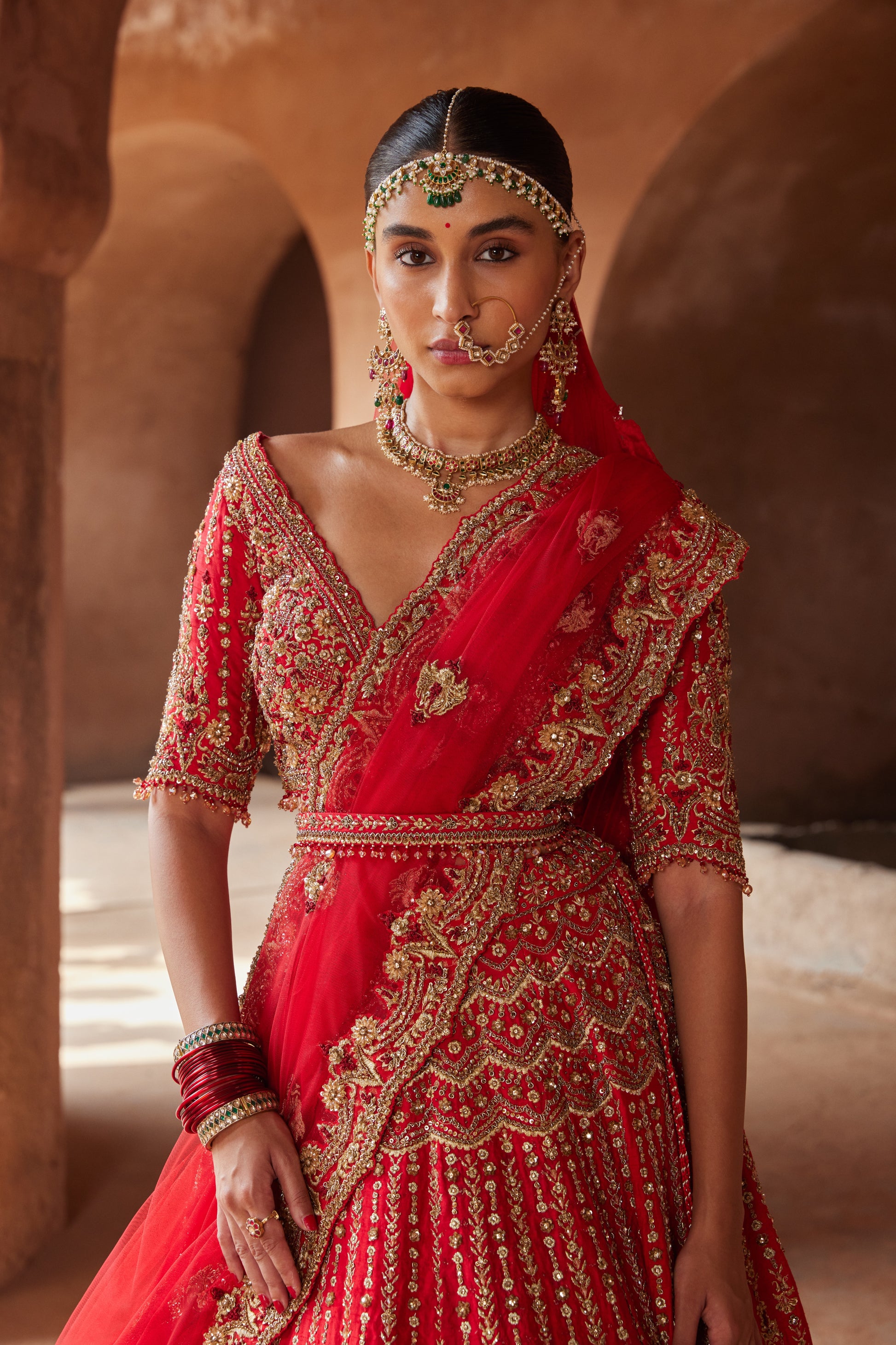 Dazzle in this vermilion red raw silk lehenga choli, enhanced with a refined belt and a net dupatta intricately embroidered with gold zari, dabka, sequins, beads, and crystals. Deeper red resham accents add depth and richness to the design, creating a mesmerizing contrast. Complete your bridal ensemble with the optional embroidered net veil, adding a regal and ethereal touch to your look. Perfect for the bride who cherishes tradition with a hint of modern artistry.