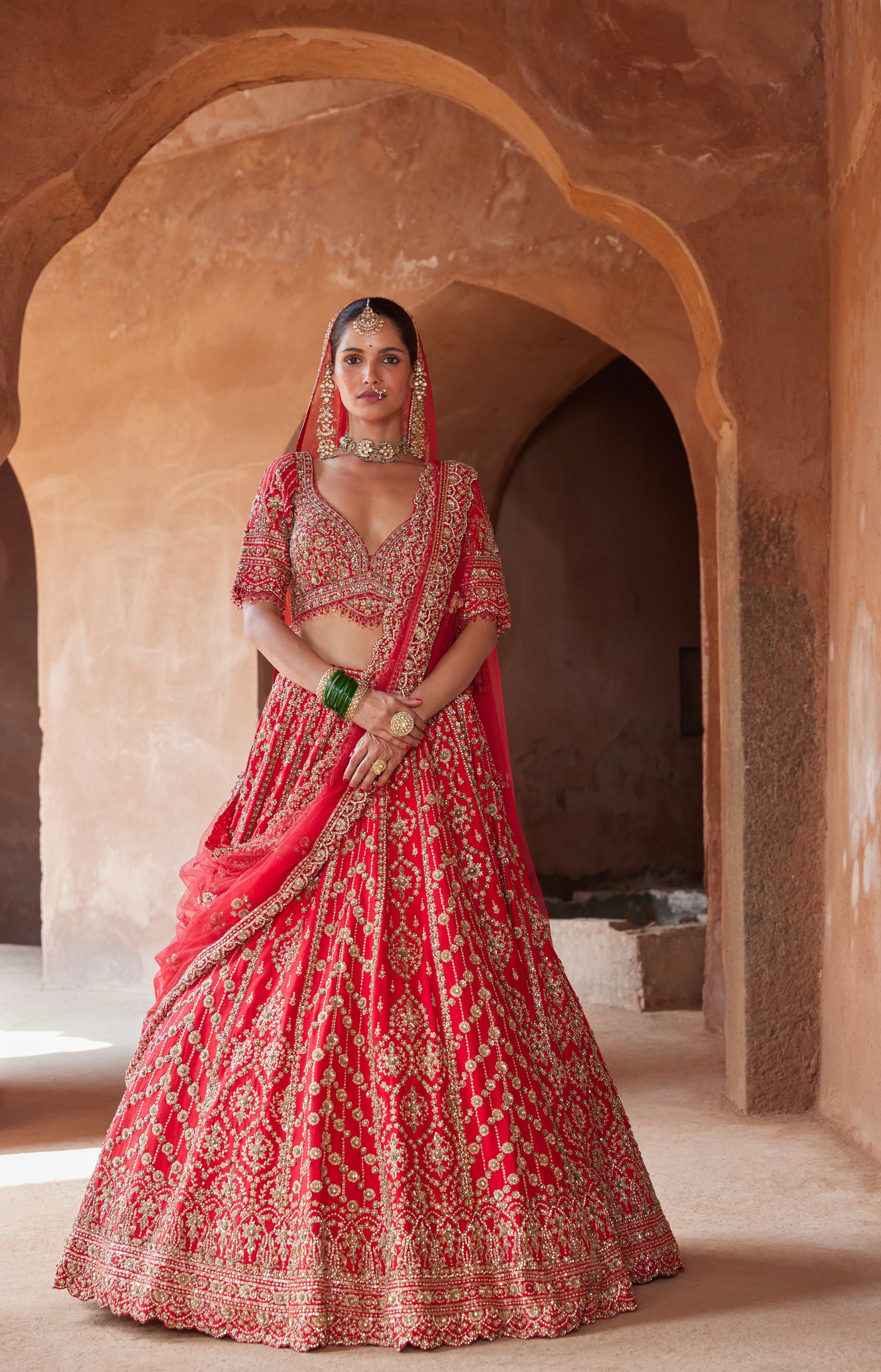 Make a bold statement in this vibrant red raw silk lehenga choli, beautifully paired with a net dupatta. The dupatta features alternating panels of intricate embroidery, adorned with gold dabka, zari, sequins, beadwork, and sparkling crystals, creating a mesmerizing play of textures. For added grandeur, style the ensemble with an optional second net dupatta, perfect for enhancing your regal bridal look. A captivating choice for the bride who seeks timeless beauty with a touch of opulence.